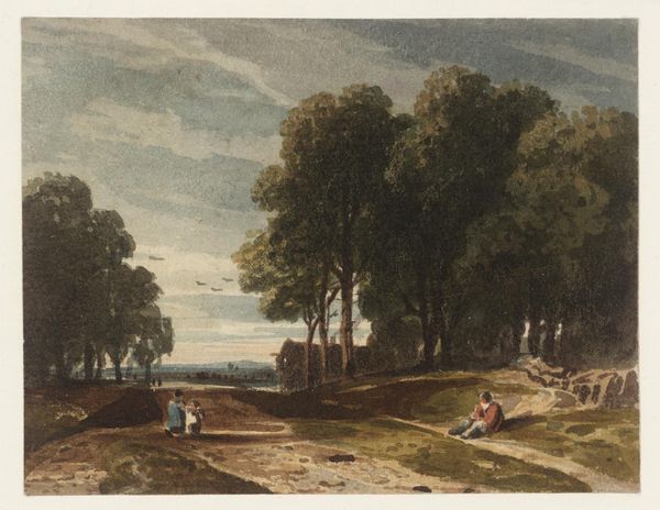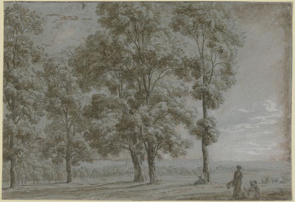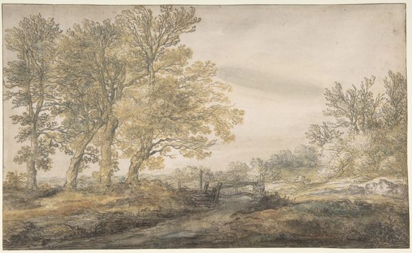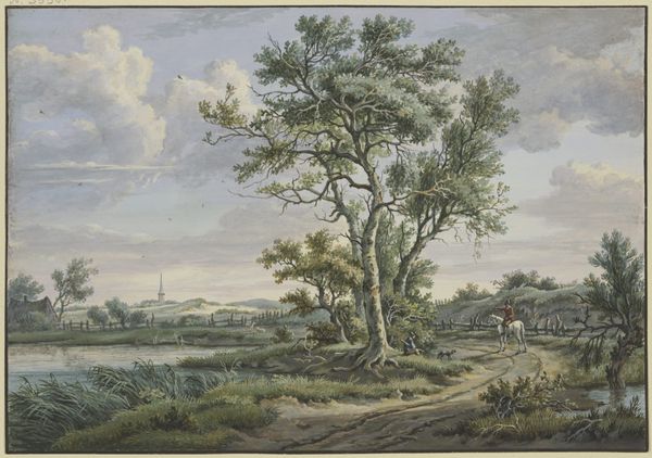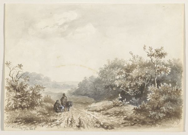 Curator: Let’s turn our attention to this tranquil landscape, "In t'Duin te Bloemendaal," created in 1801 by Jan Evert Grave. It’s rendered with pen, chalk, and watercolor, quite a delicate combination of media. Editor: The immediate impression is one of airy lightness, wouldn’t you agree? The pale washes create a sense of boundless space; a vast sky and gentle slope of land, sparsely dotted with trees. Curator: Absolutely. Consider the context: this was likely created en plein air, outdoors, which speaks volumes about the artist's relationship to the land itself. We see an emphasis on immediacy and the act of observation, trying to catch a fleeting moment. How do these Romantic-era depictions influence the societal consumption of "nature"? Editor: Interesting question. Before answering it, consider the careful layering of those pale hues; the faint outlines giving form to those cumulus clouds—notice also the two figures discreetly placed. All create depth, even luminosity within this landscape, yet the scene’s structural logic is fairly simple. We see the clear, yet gradual transitions of tones—it pulls the viewer’s eye slowly from left to right, following an intuitive path. Curator: And those two figures aren’t just there to fill the space; they are workers or peasants perhaps; but are surely central to the narrative. Look how the artist employs simple lines and shading to imply their social station, making us aware of the working relationship to the land. Also note the clear brushstrokes indicating the earth is uncultivated. This makes visible the class structure involved with “land ownership”, thereby emphasizing an emerging middle class. This artist is engaging with production on every level. Editor: That may be true. But it's precisely through his manipulation of perspective, balance, and particularly tone that Grave conveys his particular romantic feeling about this setting. The faint, airy medium accentuates nature’s fleeting beauty. It is more about that sense of freedom. Curator: Perhaps we both read a portion of truth into it. Ultimately, art like this speaks of the cultural shifts in landscape perception itself. Editor: Agreed; it highlights how much both objective and subjective interpretation matter in how we regard these works today.