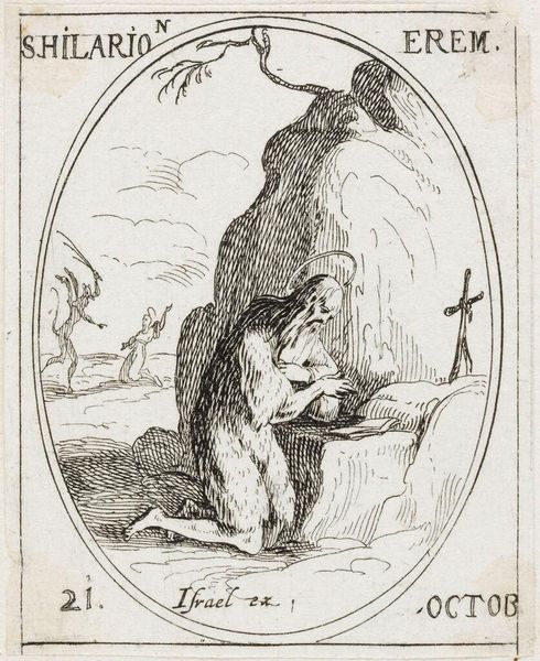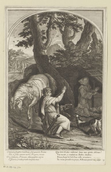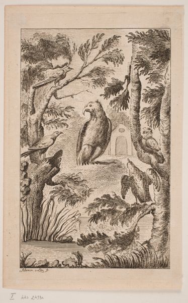 Curator: Ah, a rather charming print! This is Jan Punt's "Landscape with Stork and Fox", made in 1758. It's an engraving. Editor: Charming, yes, but I’m getting serious Aesop's Fables vibes – is someone about to get a painful life lesson? Curator: Precisely! Punt based his work on one of La Fontaine's Fables: the story of the fox and the stork. In that story the sly fox invites the long-beaked stork to dine, but serves soup on a flat stone that only he can manage to lap up. The revenge happens, naturally! It really points to those anxieties in that 18th-century moment around social hypocrisy and class disparity. Editor: Ah, so that slightly smug look on the fox’s face isn't just my imagination! I notice it is titled in French—which definitely signals that this is aimed toward a particular well-read, elite class. Curator: Certainly, though prints made the fable accessible to a larger public audience, it became democratized. The print medium itself contributed to the fable’s social critique and reach, playing with notions of transparency and accessibility. Editor: Transparency... Ironic, considering the tale is about deception! Speaking of which, Punt's style – while proficient – feels a tad stiff. I feel a kind of static quality. What do you make of the landscape, which to me seems rather staged. Curator: The somewhat artificial Baroque landscapes definitely speak to that era's interest in idealizing nature, shaping it to convey moral messages but there's also some connection to contemporary political and economic realities of that era: think cultivated aristocratic estates. Also, look closely. Punt creates the scene from tiny intricate details; his use of engraving really underscores that Baroque interest in decoration and that period's artistic values. Editor: You are right, now looking at it longer, I appreciate it a lot more, especially how the two characters dominate and almost create the scenery surrounding themselves. They tell their own stories regardless of landscape Curator: Absolutely. A small but very intriguing window onto social mores and artistic conventions of its time! Editor: A good way to close this case then, onto the next artwork.