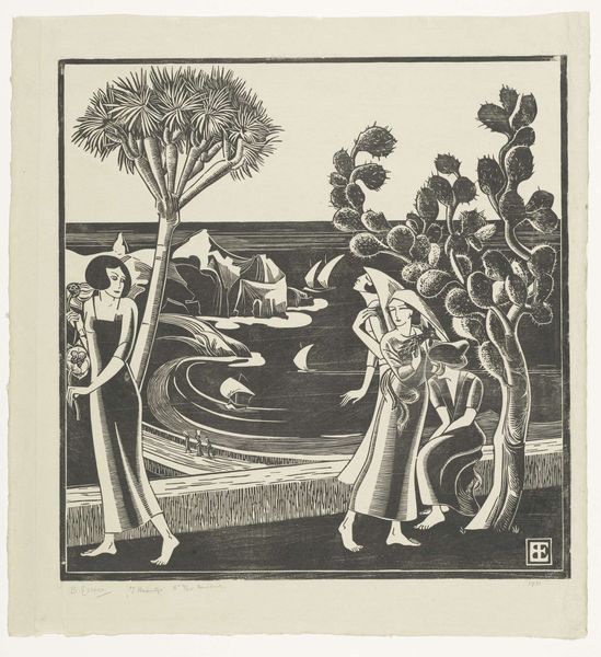 Curator: Looking at Bernard Essers' woodcut from 1927, "Pijnboomen (Bretonsche baai bij eb)," the first thing I feel is…peace. A stark, graphic peace, but still a quiet stillness. Editor: It strikes me as less peaceful and more controlled. The graphic quality you mentioned – the high contrast, the precise lines of the woodcut medium – those aren’t accidents. Essers chose this medium. Curator: Ah, but control can lead to peace, no? Think of gardening, the controlled chaos that results in… tranquility. Look at the geometry, for example. Everything aligns, creating rhythm through repetition, echoed across the water… It is a composition striving to connect nature with abstraction. Editor: Rhythm certainly. I mean, those precise lines carving out trees and rocks, they demonstrate skilled labor, wouldn’t you say? How long must it have taken to carve out so much fine detail? Essers has transformed a block of wood – an object of practical use—into something sublime. Curator: Absolutely! He understands his materials. This wasn't a happy accident; Essers felt something here. It speaks, to me at least, to this ineffable relationship, the give and take, between the land and sea. The almost brutally stylized rendering of nature doesn’t detract, but actually adds to the work’s…mystery. Editor: What fascinates me, too, is how the material limitations themselves can define the entire aesthetic. Each groove painstakingly chiseled from the block dictates form, and defines the image—creating shadows and light by what is removed, not what is applied. It shows the beauty and potential residing in the materials and method itself. Curator: So we're agreed, in the end, despite coming from very different perspectives! The print speaks to a human interaction, be it controlled labour, or our endless artistic dance, and desire to capture that great unknown outside. Editor: Yes. Both are vital readings. After all, art invites many perspectives, reflecting both its creation and interpretation.