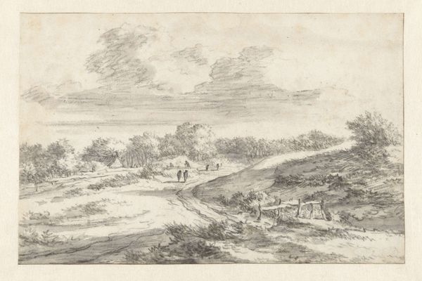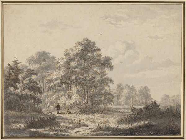This landscape, "Waldweg, links Durchblick auf eine Schloßruine, rechts in der Ferne ein Städtchen", was created by Johann Caspar Zehender. Note the skillful use of line and light to create depth. The composition, anchored by the dark foreground, subtly guides our eye through the scene towards the distant town. The linear perspective, combined with the tonal gradations, creates a sense of space. Look how Zehender has framed the view with trees on either side, drawing attention to the structural elements of the composition. The castle ruin on the left acts as a counterpoint to the town on the right, destabilizing a conventional landscape. The drawing's monochrome palette enhances the structural clarity, allowing us to focus on the interplay of form and space. Zehender challenges our perception by playing with depth and perspective. What may appear as a simple scene is a thoughtful manipulation of form.