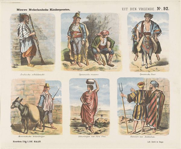 Editor: So, this print is called "Uit den Vreemde," or "From Abroad," made sometime between 1865 and 1875 by George Lodewijk Funke. It seems to depict different figures from around the world, almost like ethnographic studies. What do you see in this piece beyond its face value? Curator: I see a visual catalog deeply entrenched in 19th-century European imperialism. The print presents a carefully constructed image of "the other," categorizing and displaying people from different cultures as if they were specimens. Note how each figure is labeled—"Arabian Guard," "Spanish Farmer"—reducing them to types rather than individuals. How might this reinforce a sense of European superiority? Editor: I see what you mean. It’s like a collection of postcards from exotic locations, but with a controlling, almost objectifying gaze. Is the choice of medium, engraving, also relevant to this? Curator: Absolutely. Engraving, as a reproducible medium, allowed for widespread dissemination of these images, solidifying and perpetuating stereotypes. The "Neue Nederlandsche Kinderprenten" title is also telling. This imagery was meant to educate children, shaping their understanding of the world and their place within it. Editor: So, it's not just about depicting different cultures, but also about teaching a specific, and potentially biased, worldview? It's a kind of cultural curriculum presented as art? Curator: Precisely. Consider the power dynamics at play: a Dutch artist representing people from different lands for a Dutch audience. Who has the power to define and represent whom, and what are the implications of that power? What ideologies might these representations uphold or challenge? Editor: It definitely makes me see it differently. What initially seemed like a simple depiction of different people now seems heavy with historical and social implications. Curator: Recognizing these power dynamics and questioning the representations presented to us is essential.