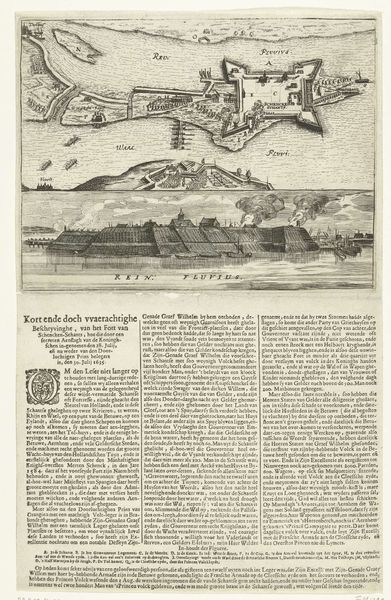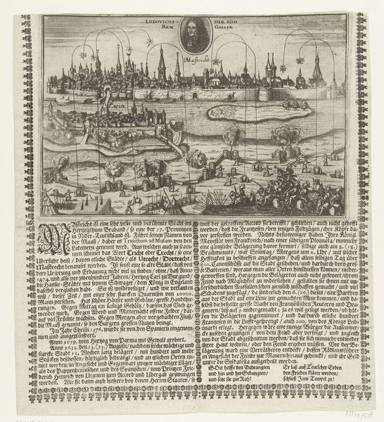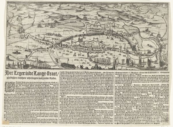Curator: I am immediately struck by the density of information packed into this image. There’s almost a claustrophobic feeling conveyed by the closely-packed details. Editor: Well, this engraving, created in 1622 by Dirk Eversen Lons, titled “Siege of the Papenmuts Sconce”, is exactly that: dense with information about a very specific moment in history. What are you drawn to particularly? Curator: The depiction of power, perhaps. It's fascinating how it frames war as urban planning, where fortifications are reduced to shapes on a map. We’re meant to understand it intellectually, not emotionally. Do you find that clinical detachment disturbing? Editor: The 'clinical' aspect is a byproduct of the medium: an engraving meant to document and disseminate military information. Think about the labor involved, though – the skilled hand meticulously etching these lines onto the copperplate, and the subsequent reproduction of many copies. This process speaks to a specific investment of material and energy into this event. Curator: Absolutely. And that investment comes with ideological weight. Look at the choice to represent this "siege" from a detached, almost God-like perspective. It sanitizes the violence and promotes a specific narrative of Dutch military prowess. I'm always interested in how art manipulates our perception of war and trauma, especially through this type of landscape rendering. Editor: For me, it emphasizes how even these calculated displays are material acts. The engraver transformed an event of war into an object intended to be traded and understood through touch. The texture of the lines, the ink on the page... these are direct results of this human need to control territory and knowledge, expressed physically. Curator: Precisely! We have these neat little shapes, almost abstract representations of fortifications and siege strategies. And then below it all, we’re invited to contemplate the broader societal structures that reinforce these representations and their political justifications. Editor: Right, by studying how an engraver fashioned this artifact, and who would see it, we’re closer to uncovering its complex purpose beyond simply presenting an aerial depiction of battle.