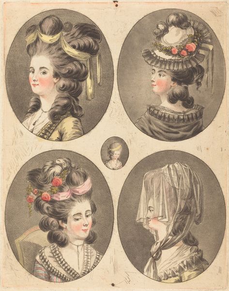 Editor: So this print, “Gallerie des Modes et Costumes Français, 1776”, presents a collection of Rococo hairstyles. They're quite extravagant, aren't they? Made of watercolor illustration on, perhaps, laid paper. What’s striking to me is the contrast between the seemingly effortless elegance and what I imagine must have been quite a labor-intensive creation process. What catches your eye in this image? Curator: Absolutely, the materiality here is key. Let’s consider the physical making. How were these towering hairstyles achieved? Think of the hours spent by the *coiffeurs*, the use of wire frameworks, padding, perhaps even pomatum – a perfumed ointment – all requiring skilled labor and specific raw materials. These weren't just hairstyles, but constructions built upon the head. And then, consider the paper and the ink used to disseminate this image. Do you think these materials tell a story beyond aesthetics? Editor: Well, now that you point it out, definitely. The print itself, mass-produced to some degree, makes these aristocratic styles accessible, at least visually, to a wider audience. Does that democratizing element somewhat challenge the exclusive nature of high fashion at the time? Curator: Precisely. We are confronted by tensions inherent in production of luxury and its representational form that could reach consumers, even if they could not purchase it, raising aspirations and potentially feeding social discontent. These images of high fashion circulated, demonstrating exclusivity while simultaneously making it more available for scrutiny. Notice the different *coiffures*. They are not identical and it raises the question: was this all about the consumption? Or did making and labour enter here? Editor: It's amazing how a seemingly simple print reveals so much about the complex social and economic structures of the time. I hadn't thought of the labor involved as something inherently a part of the piece itself. Curator: Indeed, and hopefully you'll think more critically about the means and the labour of representation when viewing and creating art!