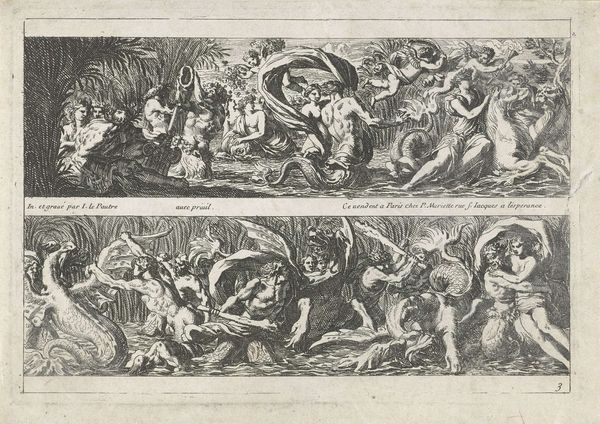 Curator: Here we have "Two Designs for Friezes with Acanthus Scrolls from: Frises, Feuillages ou Tritons Marins à la romaine", an engraving by Jean Le Pautre, created between 1635 and 1645. Look at how densely packed the composition is. Editor: It feels like an explosion of foliage and bodies! Almost overwhelming, with the contrast of the swirling acanthus leaves against the more defined figures. Is it meant to feel so frenetic? Curator: The density speaks to the Baroque aesthetic—an embrace of ornamentation and dynamism meant to impress. These prints served as inspiration for artisans and architects. The title itself suggests multiple possibilities—friezes with foliage, or even with Tritons, a hybrid human and sea creature from classical mythology. Editor: Right, I notice these muscular figures interspersed within what appear to be garlands of flowers and swirling vegetation. It feels almost performative, this display of idealized bodies intertwined with elements of nature. Are they simply decorative or trying to communicate specific themes? Curator: It's highly likely that classical motifs allude to power, wealth and authority. Friezes such as these were often found in palaces and grand houses; signaling sophistication. The "à la romaine" aspect emphasizes the Roman influence prevalent during the Baroque era. Editor: So, an assertion of status and cultural legitimacy through visual language. Knowing it’s an engraving also highlights the political economy of art; these designs allowed for the dissemination of the Baroque aesthetic. Accessible opulence, if you will. Curator: Precisely. Printmaking played a significant role in disseminating artistic ideas and trends. Le Pautre was instrumental in shaping French decorative style. These images also helped propagate the dominant socio-political ideology by associating it with grandeur and tradition. Editor: Looking closer at the bottom design with the seated portrait, framed in the wreath; that really speaks to this idealization. There is a construction of power; visually reinforced through classical imagery, meant for display. Curator: An efficient little package that carries both cultural aspiration and a commercial imperative. Editor: Seeing this artwork today, allows us to see how the past, these carefully constructed symbols and aspirational aesthetics are made real within a historical context of inequality. Curator: Absolutely. It serves as a powerful reminder of the political function of art and its capacity to reflect the dominant social narratives of its time.
