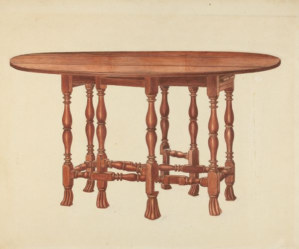 Carl Strehlau made this watercolor painting of a Pa. German Table, sometime in the 20th century, using paper and paint as his primary materials. This work showcases an appreciation for vernacular design and historical craft traditions. The table itself, with its turned legs and scalloped apron, speaks to the skills of woodworkers, who typically employed hand tools. While Strehlau used watercolor, a traditional fine art medium, his choice to depict a piece of furniture elevates the everyday to the level of art. The process of rendering the table in paint invites us to consider the object’s form, texture, and the way it might have been used in a domestic setting. Ultimately, Strehlau's painting prompts us to reflect on the value we place on both handmade objects and the artistic representations of them, blurring the boundaries between art, craft, and everyday life.
