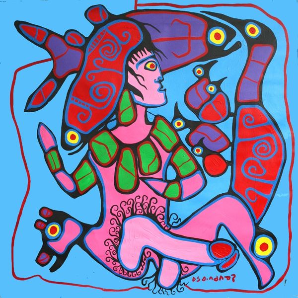 Editor: Here we have Norval Morrisseau's painting, "Stained Glass Effect," created with acrylic paint. The vibrant colours and thick black outlines immediately grab your attention, almost like looking through a stained-glass window, but the figures feel really abstract. How would you interpret the techniques used in this painting? Curator: It's vital to consider Morrisseau's use of materials in relation to his Anishinaabe heritage and the exploitative history of resource extraction in that territory. This image points to the labour of translating traditional stories into a modern, accessible visual language, what was at stake in those cultural and artistic shifts, and how this work entered global art markets. How might mass production and consumption shape Morrisseau's artistic decisions here? Editor: That’s a great point! Considering its "pop art" feel, could it also be referencing mass-produced images? How does that change its context? Curator: Precisely. Look at the flat application of the acrylic paint. It almost denies the artist's hand. It removes a sense of hierarchy between "high art" and everyday commercial images, creating some tension between traditional subject matter and this supposedly democratic and accessible method. Does this ease our understanding of the subject, or commodify it further? What impact could that commodification have on cultural preservation? Editor: I hadn’t thought of the implications of those choices. It's fascinating how his use of accessible materials opens up new perspectives. I see how he critiques boundaries. Curator: And this makes his work a unique statement on cultural preservation, identity, and the complexities of artistic production. This painting reveals how artistic processes embed cultural meaning, especially when considering the history of material exploitation of Indigenous land and resources. Editor: Thank you! Thinking about this painting through materiality gives me a lot to consider. Curator: Indeed. Let’s remember that considering production techniques lets us critically examine artworks and society’s impact.