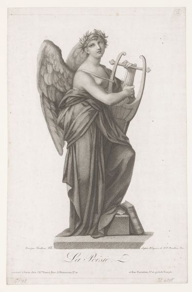 Curator: Welcome. We're standing before "Allegory of Victory", an engraving created by Lucas Kilian in 1614. It’s currently held here at the Rijksmuseum. Editor: Okay, my initial reaction? This winged figure has such a solid presence—she radiates serene strength. I’m fascinated by how the monochrome brings out these incredible textures, from the smoothness of her skin to the feathered wings. There is also Latin script within the engraving, it’s almost like graffiti art in that the Latin has this street vibe to it. What's your perspective? Curator: Indeed, it's a beautiful representation of baroque allegory. The figure embodies "Victoria", Roman goddess of Victory, celebrated throughout the evolving concept of empire from Antiquity to the Early Modern Era. It showcases Victory as both a symbolic ideal and a propagandistic image of triumph. Editor: I see what you mean—holding up that laurel wreath while bearing that shield feels like a deliberate statement. It’s almost as though this figure of "Victoria" is both offering peace and reminding everyone of her battle strength, it's intriguing! What about Kilian as an artist—where does he fit into all of this? Curator: Kilian belonged to a family of Augsburg engravers who greatly contributed to disseminating visual culture through print. "Allegory of Victory" speaks to how printmakers engaged in political and intellectual dialogues, creating visual arguments through established iconographic vocabularies. The text incorporated further clarifies its moral underpinnings. Editor: Makes total sense. For me, seeing the fine detail achievable with the engraving and contrasting that against what I imagine the cultural moment was like, makes the work more impactful. It’s an image with deep roots and bold wings. Curator: Exactly. And hopefully it's encouraged a re-examination of what "Victory" truly represents for both past and present societies. It prompts necessary reflections on the values associated with triumphs and consequences too. Editor: Absolutely. "Allegory of Victory" leaves you thinking not just about who wins but what those wins really mean. It’s a thoughtful end note.
