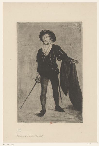 Editor: Here we have "Vaandeldrager" or "The Standard Bearer" from 1658, an engraving attributed to Prinz Ruprecht. The play of light and shadow is captivating. What visual elements stand out to you in this engraving? Curator: Observe the artist's strategic deployment of chiaroscuro. The figure emerges from a nebulous background, primarily due to light. Note the diagonal thrust of the standard; how does that linearity affect your perception? Editor: It certainly adds dynamism, breaking up the stillness you might expect in a portrait. The vertical of the flag contrasts well with his subtle pose. Curator: Precisely. And what of the tonal variations across the surface? Rupert uses value to define the Standard Bearer. Consider, the darker shades establish form, creating the three-dimensional form out of two-dimensional medium. Do you see how this manipulation impacts depth of field? Editor: Yes, the face is luminous and then the gaze follows to the plumes in his cap. The darker parts around his neck seem to emphasize the lightness, like emphasizing that its really light. Curator: His attention to line and tone generates visual tension. Observe too, the layering of textures, almost palpable—the metal breastplate versus the softness of the feathers, all constructed through marks upon a copper plate. What narrative does that suggest about material hierarchy, line weight, shape and space? Editor: I hadn’t considered that, but I agree, I can understand the materials simply by the forms in this space, by its contrast of colors in such a muted picture. It emphasizes contrast and gives form, line, color all together! I will think more about the relationships between medium and materiality now. Curator: A rewarding endeavor, indeed!