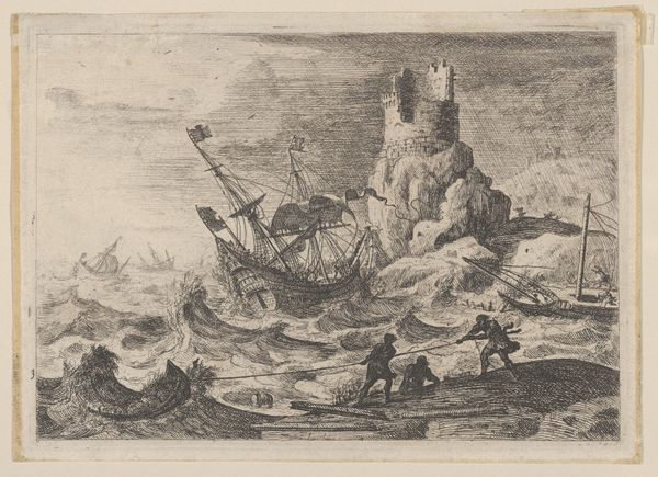 Editor: Here we have Matthieu van Plattenberg’s etching, “Schipbreuk,” created sometime between 1617 and 1660. It depicts a tumultuous shipwreck, and the scene feels incredibly chaotic and almost biblical in its intensity. What strikes you most when you look at this piece? Curator: The symbol of the ship, especially one wrecked against the rocks, has long been a potent image, hasn’t it? It represents not just physical danger, but also the fragility of human endeavor against the overwhelming forces of nature, fate, or even divine wrath. Do you see how the jagged rocks echo the broken masts? It's a visual language of disaster, quite consciously deployed. Editor: That makes sense. I hadn't really thought about how the composition reinforces that feeling. Curator: Beyond the immediate drama, consider what the "ship" might stand for, culturally. In the 17th century, maritime trade was booming. For the Dutch Republic especially, ships *were* prosperity and power. So a shipwreck carries further resonance; perhaps something about the limits of ambition, or the precariousness of earthly fortunes? Even that sudden beam of light in the corner - is it hope, divine intervention, or simply cold, indifferent illumination of a catastrophe? Editor: So it’s not just a picture of a shipwreck, it's also commenting on larger societal themes. I will definitely need to spend more time interpreting the meaning of symbols! Curator: Indeed! It is a powerful skill which gets better over time and repetition. Editor: Thanks so much, this really opened my eyes to new ways of reading art. Curator: My pleasure. Symbolism adds an extra dimension of understanding to an artwork, a real layer of complexity to unpack.