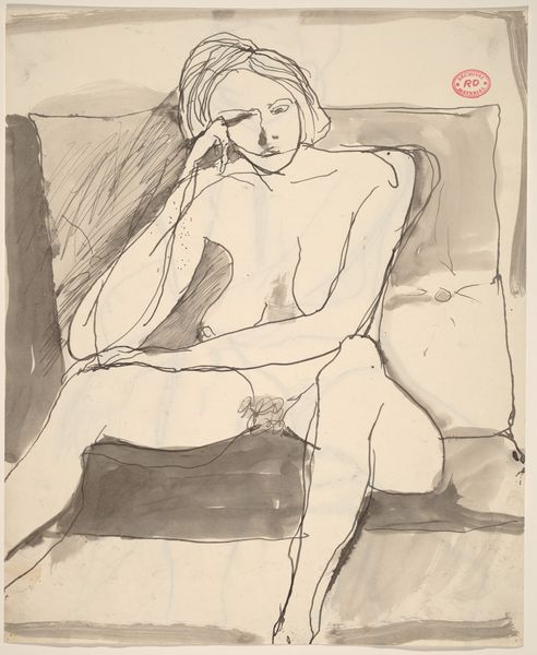 Theodor Pallady created 'Nude on the Couch' with watercolor, probably in his studio. It has a sense of immediacy like he was working on the spot. Pallady's delicate touch with the watery paint almost feels like a caress. Look at how the pigment pools and settles; the thin washes create depth through layering, like light filtered through skin. The flesh tones are subtle, built from a palette of pinks, grays, and ochers. See how he defines the form not with hard outlines, but with soft, blurred edges. Take a look at the line that trails from the figures face towards the bottom of the canvas. The line is thin and pale in areas and darker in others. The texture that is created is raw and honest. Pallady’s style is reminiscent of other painters such as Vuillard. Pallady presents art as an ongoing dialogue with himself and other artists, a space for ambiguity, and infinite possibilities.