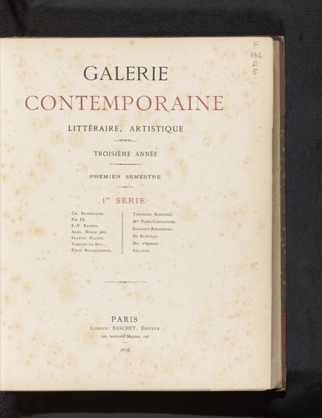 This is the cover of "Galerie Contemporaine," a literary and artistic journal published in Paris by Ludovic Baschet in 1880. The journal's title, emblazoned in bold red and black, announces its mission to capture the spirit of its time. In the late 19th century, the rise of mass media created new opportunities for artists and writers to reach a wider audience. Publications like "Galerie Contemporaine" became important platforms for showcasing new talent and ideas. The journal’s list of contributors reads like a who’s who of the French avant-garde. By studying publications like this one, we can gain insight into the complex social and cultural forces that shaped the art world of 19th century France. Researching writers, artists, publications, and their interactions can allow historians to reconstruct the network of relationships that defined the cultural landscape of the time. The meaning of art is contingent on social and institutional context.