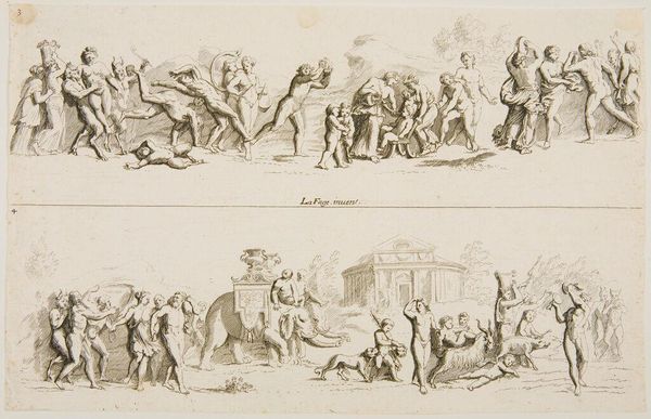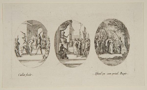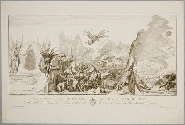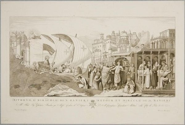 Curator: Looking at this print titled "Miracles of the Dead Ranieri," created by Conte Carlo Lasinio, what comes to mind? Editor: The first impression is like a faded dream, a collection of moments barely held together. It feels distant, ethereal, almost… ghost-like. Curator: This work depicts several miracles attributed to Saint Ranieri, each vignette showcasing his posthumous influence. The scenes are very deliberately arranged, consider the placement of the figures. Editor: True, it's less about individual stories and more about the cumulative effect – the sheer volume of Ranieri's presence even after death. The composition guides the eye, like reading a story. Curator: Saint Ranieri is a local saint, a patron figure. The artist chose a visual language that’s both commemorative and subtly instructional. Editor: It's like a faded fresco brought back to life in monochrome. It captures a sense of history, filtered through someone else's memories. A poignant reminder that even saints become echoes over time.