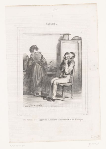 This lithograph, by Paul Gavarni, captures a fleeting moment with delicate lines and contrasting textures. The composition is divided into two distinct zones: one of static labor and another of ephemeral passage. A seated worker is in the left foreground. He is textured with rough crosshatching, his figure solid and anchored to the earth. In contrast, a woman drifts through an implied doorway; she is rendered with lighter, more fluid strokes. The worker's gaze is directed towards her, creating a visual and narrative tension. There is a dialectic between permanence and transience. This tension is echoed in the stark contrast between the rough garments of the worker and the elegant attire of the woman. Gavarni uses the semiotic language of clothing and posture to explore social divides and transient encounters. He invites us to consider how these structures shape our perceptions and interactions, reflecting the dynamic tensions inherent in modern life.