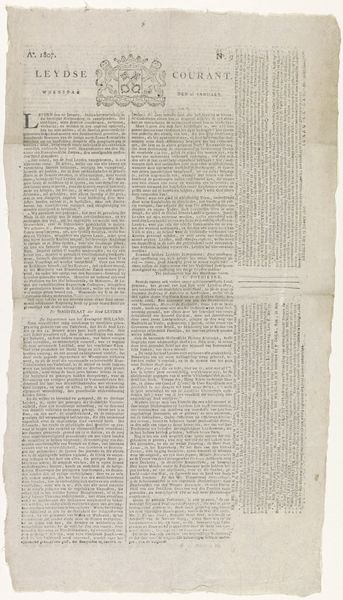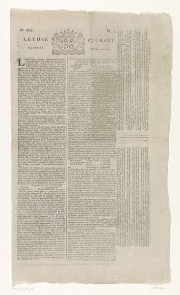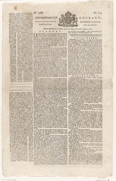 This newspaper clippings with news related to the Rendorp family was made in 1748. The visual field is densely packed, dominated by columns of tight, uniform text. The textural contrast between the coarse paper and the fine print creates a haptic tension. From a structuralist perspective, the layout reveals a hierarchy of information. Headlines serve as signifiers, organizing the text into discernible units. This structured presentation reflects the Enlightenment's emphasis on rationality and order, seeking to categorize and disseminate knowledge efficiently. The semiotic system at play here uses typography and layout to convey not just content, but also the value placed on informed citizenry. The regular grid of text is punctuated by the occasional emblem, a symbolic marker that adds another layer of meaning. This interplay between textual and symbolic elements challenges a purely literal reading, inviting us to decode the cultural and political subtexts embedded within the news. Ultimately, the formal arrangement of this newspaper functions as a microcosm of its time, encapsulating the era's pursuit of knowledge and its underlying power structures.