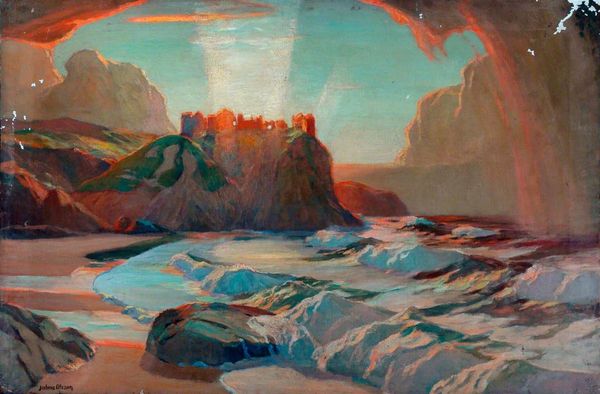 This untitled painting is by the Polish artist Zdzislaw Beksinski. At first glance, the large rock formation dominates the canvas, its imposing structure evoking a sense of solemnity. Beksinski manipulates color and light to enhance the visual impact; the somber palette of browns and blues contrasts sharply with the fiery red sky, heightening the drama and emotional tension of the scene. Beksinski’s distinctive approach to form is evident in the jagged edges and irregular surfaces, which lend the rock a crude texture. This technique reflects a post-structuralist inclination to dismantle established orders of representation. The scene destabilizes conventional categories of beauty, challenging the viewer to confront a world where decay and devastation hold a strange allure. Ultimately, it is the formal composition – the interplay between color, form, and texture – that situates this work within a wider cultural dialogue about the anxieties of modern existence. Beksinski compels us to consider how art can unsettle, provoke, and offer new interpretations of our perceived reality.