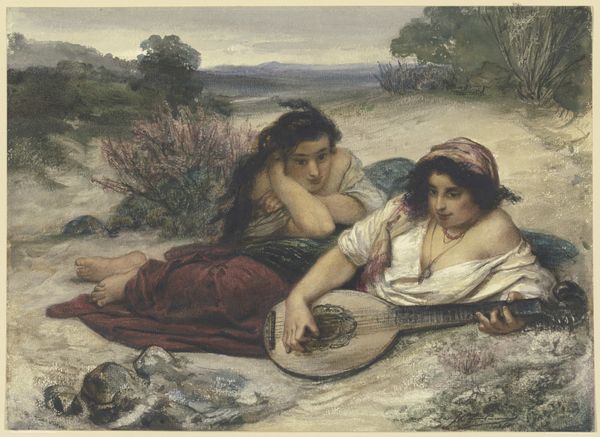 Henryk Siemiradzki painted "Das Gespräch" with oil on canvas. The painting's composition, with its classical subject matter bathed in soft light, presents a scene of tranquil contemplation. Siemiradzki masterfully employs color and form to guide the viewer's eye. The cool blues and greens of the landscape contrast with the warm skin tones of the figures, creating a sense of depth and drawing attention to the interaction between the two women. The linear structure of the stone bench provides a horizontal anchor, while the draping fabric adds a dynamic, flowing counterpoint. The painting can be seen as a semiotic construction, where gestures and garments act as signs. The classical garb and serene setting evoke an idealized past, reflecting a longing for order and harmony. Yet, the intimate exchange between the figures hints at a deeper narrative, destabilizing the surface tranquility with implied emotional complexity. The enduring appeal of this artwork lies in its sophisticated interplay of form and content.