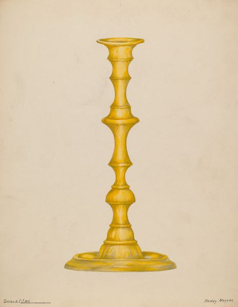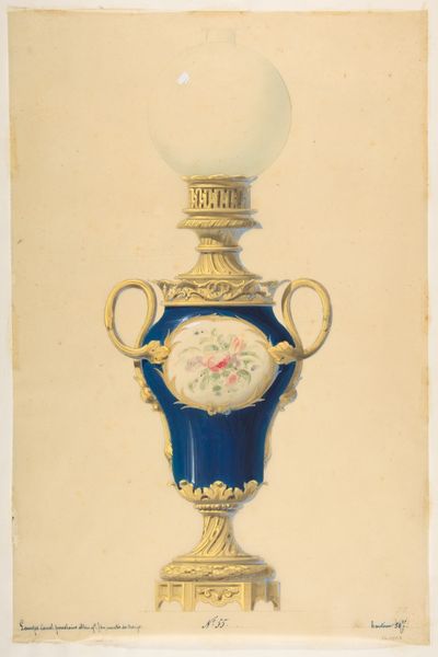 Curator: Ah, welcome! Let’s spend some time with "Lamp," a watercolour from 1940. What’s your first take on this one? Editor: Well, the overwhelming blueness immediately gives it a sense of calm, but there's something about the rigid symmetry that feels almost…clinical. It's an odd combination, like serenity in a laboratory. Curator: A clinical calm. I love that! I can certainly see it in the exacting rendering of the glass. Note how the artist plays with the translucence, especially in the stem and the bowl. What do you make of it? Editor: It’s quite skillfully done. There is clear attention given to capturing how light would move through the lamp's body. The detailing on the base feels less studied, almost hurried, but the play of light in the blues does catch and hold my gaze. Do we know who made it? Curator: Good question! The artwork is by John Dana, employing watercolors. It reminds me of old design renderings for mass produced goods. Utilitarian beauty elevated for a potential consumer. Editor: And perhaps that's where my clinical reading comes from! This isn't just a lamp, but a meticulously planned *object*. Look at the interplay of the golden bronze with that intensely artificial blue. The contrast draws the eye. But what does it *mean*, beyond its formal qualities? Is it just about design? Curator: Perhaps. It also resonates as a reflection of the time. Even domestic objects reflected a new sense of streamlined, almost utopian ideals achievable through manufactured objects. This lamp becomes less about illumination, and more about aspirations to progress. And personally? I could see it cast gorgeous, theatrical shadows, transforming the mundane into pure magic. Editor: Theatrical shadows… a lovely contrast to that cool, calculated design. It’s funny how sometimes a simple drawing can contain so many unexpected angles, both visual and conceptual. Curator: Exactly! Isn't that what makes art so compelling? Editor: Indeed. Each viewpoint enriches our experience of the piece.
