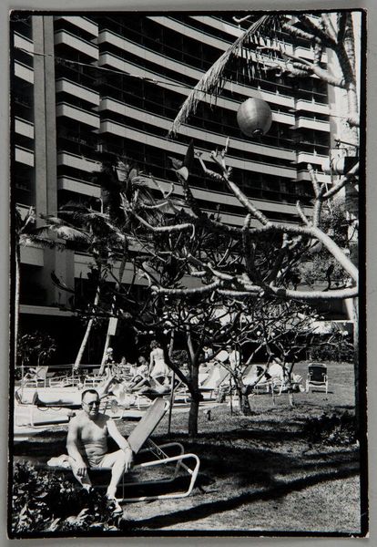 Curator: Bill Dane's "Untitled (Berkeley)" presents us with a strikingly geometric yet organic study of urban space. Editor: It's like a stage set, almost theatrical, this black and white image. The light is soft but the lines are so sharp. Curator: The interplay of natural and man-made forms is central, isn't it? The tree's limbs mirroring the staircase railings. Editor: Absolutely. And the cracked glass pattern near the stairs feels so very... Californian. A bit broken but still beautiful. Curator: Considering Dane's tendency to mail his photographs, one might wonder if this scene resonated with him on a personal level, a snapshot of his everyday. Editor: Perhaps he saw in that jumble of shapes a kind of abstract portrait, the essence of a place captured in a single frame. Curator: It’s a quiet photograph, that speaks volumes. Editor: Yes, it does, a quiet, melancholic melody.