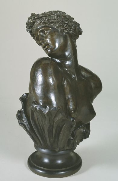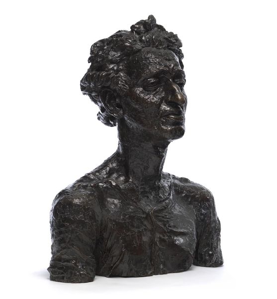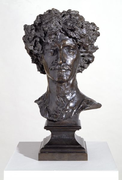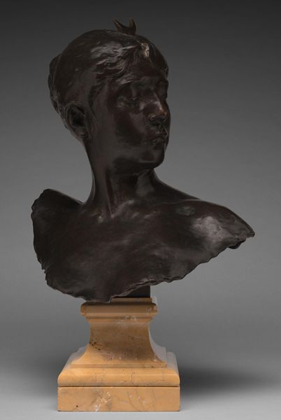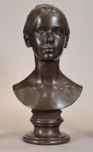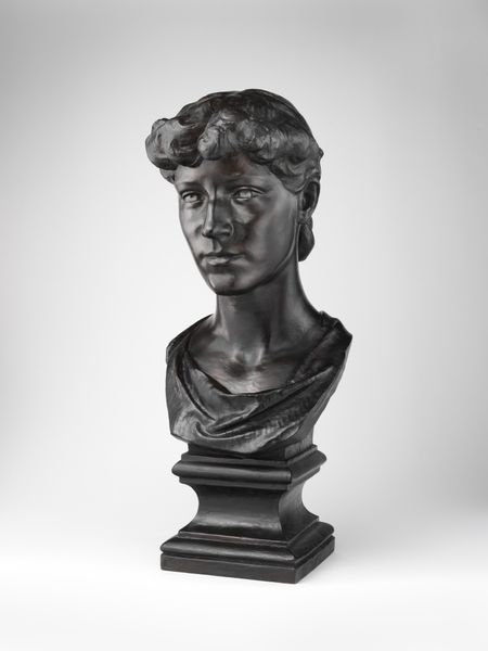 Editor: This bronze bust, titled "Mrs Macloghlin" by Sir Alfred Gilbert, really captures my attention. There is something very regal about the way she holds her head. What narratives do you think this piece is trying to convey? Curator: Well, consider the late 19th century. Gilbert was working within a society grappling with shifting class structures and gender roles. The ornate headwear, her confident gaze... it speaks to a certain assertion of identity. How does her gaze challenge or subvert expectations of women at the time? Editor: It's like she's daring you to look, refusing to be passive. Curator: Exactly. Gilbert was known for pushing boundaries. This sculpture isn't just a portrait; it’s an intervention into the social dialogues of its time. I wonder, what does her expression evoke for you? Editor: A quiet strength, maybe even defiance. Thinking about it that way, it makes the sculpture feel much more complex and powerful. Curator: Precisely. Art becomes a potent tool when we recognize its dialogue with the society that births it.