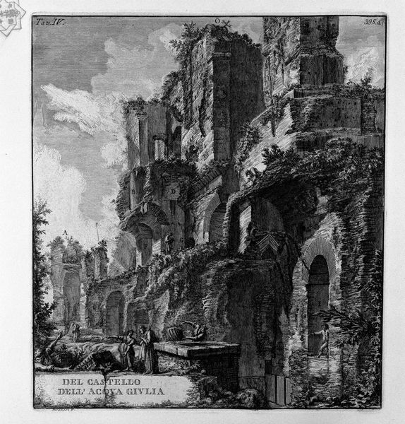 Editor: This is "View of one of monuments in ancient Circus" by Giovanni Battista Piranesi. It’s an etching, I think - look at those incredibly fine lines. It's so detailed; almost overwhelming. It gives me a dizzying feeling, like I'm looking into an impossibly deep stage set. What grabs you first when you see this, or, where does your eye even *go*? Curator: Dizzing is right. I always feel like I'm falling into Piranesi’s Rome, headfirst. It’s not just the exaggerated perspective; it's the way he crams in so many details. I think what pulls me is the theater of it all; the sheer drama he builds. Are those actual historical monuments, meticulously rendered, or fragments of dreams he’s cobbled together? Do you see how he uses the shadows? They’re not just defining forms, they are characters. I’d like to think that maybe the figures we see wandering in and out are souls caught within his wild creation of the Eternal City. What kind of a Rome is *that*? Editor: That's wild. Like, a living collage of history... or a stage set! And they're just figures in his… play, maybe? I love that. The shadows really *do* add such a sense of mystery. Curator: Exactly! Mystery. And look at how the ruins themselves almost seem to breathe – overgrown with life, and yet…crumbling. There’s a tension there. Do you get that? Editor: Totally. So, it’s not just a record of a place. It’s like, a whole *world*, complete with its own mood and logic, which makes looking at it feel more… expansive. It becomes less of looking at history to experiencing it… I guess. Thanks for pointing that out! Curator: My pleasure. That little vertigo Piranesi induces? I think that’s the whole point. A way of saying, 'Rome isn't just ruins; it’s a state of mind.’ Now, isn’t *that* something?