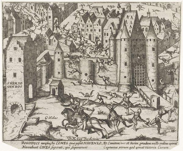 Editor: This engraving, "Verovering van Mechelen, 1580," created anonymously around 1613-1615 and held at the Rijksmuseum, depicts a cityscape under siege. It's fascinating, almost like a bird's-eye view of organized chaos. What symbols do you notice here? Curator: It is the "organized chaos" which tells a tale of trauma, violence, and even, paradoxically, civic identity. The very act of recording the siege – the artist’s rendering of cannon smoke alongside minute figures of soldiers – speaks to a cultural memory being forged. Editor: Cultural memory? Could you expand on that? Curator: The level of detail used, particularly the architecture and city layout in the background, represents more than geographical location. The buildings represent ideals of order and the desire to document their survival, the cannons evoke themes of brute force, and the smoke suggests a disruption to everyday civic life. This builds cultural continuity despite events of war. This battle isn't merely about conquering a place; it's about contesting ideas, power structures, and collective values, too. Notice, there are details and descriptions at the very bottom, in latin. It adds historical legitimacy to the printed piece. Editor: I see. So, the historical buildings give identity to a time and place, contrasting with warfare as forces try to change those familiar landmarks? Curator: Exactly! The cannon, a relatively new symbol of power during this time, also plays an important role, because it is often seen, depending on which side you're on, as either a source of liberation or destruction. This print is powerful. How do you think people may have responded when first seeing this artwork? Editor: It's sobering to realize this print acted as a historical record, filtered through someone's perspective, using symbols that have evolved in meaning through the centuries. Curator: It's a stark reminder of how we shape and preserve shared memories of momentous events and periods of transformation through iconic symbols.