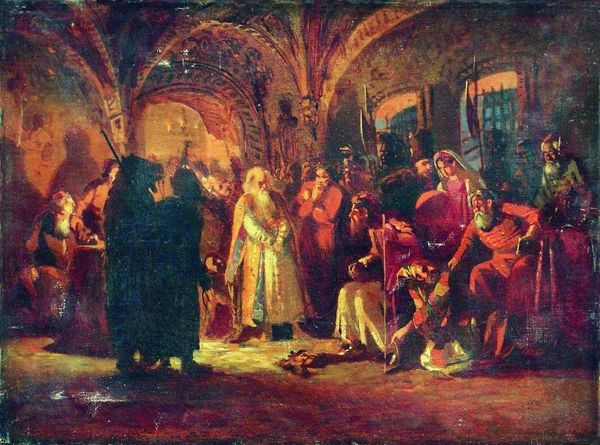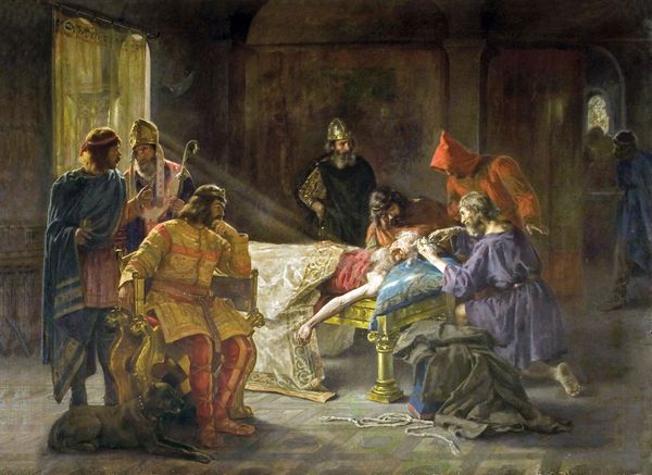 Editor: We're looking at Ilya Repin's oil painting, "Boris Godunov with Ivan the Terrible" from 1890. There's a palpable sense of unease, almost paranoia, in this dimly lit scene. What can you tell us about its context and interpretation? Curator: The tension you sense is absolutely key. Repin's choice to depict this historical encounter is ripe for analysis. Consider the power dynamics at play: Ivan the Terrible, a figure synonymous with autocracy and violence, seated, observing, while Boris Godunov, a man who would later become Tsar amidst suspicion, stands before him. How might Repin be critiquing the nature of power and succession within Tsarist Russia itself, especially considering the sociopolitical turbulence of late 19th-century Russia? Editor: So, beyond the immediate historical narrative, you see it reflecting on the nature of power structures generally? Curator: Exactly. The historical context provides a lens through which we can examine broader issues of authority, legitimacy, and the cyclical nature of political anxieties. What does the painting suggest about how societies grapple with legacies of oppression, and the ways in which past traumas continue to haunt the present? Editor: That makes me look at the figures differently, noticing how isolated they seem even within a crowd. How much did Repin's personal politics influence this work? Curator: Repin was painting at a time of rising social consciousness and revolutionary fervor. Examining his broader body of work, we see a critical eye turned towards societal inequalities and the plight of the marginalized. This painting becomes not just a historical record but an implicit commentary on the burdens of leadership and the moral compromises often demanded by political power. Does recognizing that lens shift how we consider the narrative choices that he makes in depicting these figures? Editor: It definitely adds a layer of complexity to how I understand Repin’s goals for this painting, thinking about Russian society and its future rather than the past alone. Curator: Precisely. This is how art encourages us to look critically at the past and reflect on our own present.