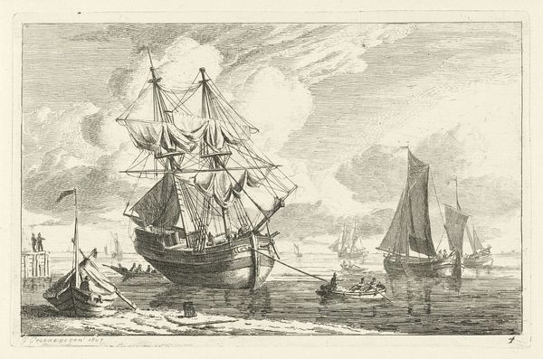 Curator: Right, let's immerse ourselves in this fascinating drawing entitled "Haven met schepen bij Hoorn," which roughly translates to "Harbor with ships at Hoorn." It's from somewhere between 1741 and 1803. Cornelis Brouwer is the artist who created this piece. Editor: The first impression? It’s serenely somber, with this muted palette that evokes a feeling of wistful stillness. I love how the dark inks dance across the paper. Curator: It's interesting you use the word "dance," because notice how Brouwer's use of line directs your eye. The composition emphasizes the ships' rigging; notice their geometry slicing through the airy sky. What's key to remember is Hoorn was a really crucial port city during the Dutch Golden Age. This drawing really gives you a glimpse into that maritime power. Editor: Exactly. Look at how Brouwer orchestrates the scene. The eye is really drawn to the intricacies of those Dutch ships—an empire afloat! You also sense the weight of history within each line. Even those little figures on the rowboats add to the daily maritime life that was unfolding at the harbor. Curator: Indeed. He also used hatching and cross-hatching techniques to build tonal depth, something that definitely would have appealed to collectors and connoisseurs. What really lingers with me is his control of ink washes and use of white space. In that quiet negative space, Brouwer achieves a great balance in his portrayal. Editor: What is it about these monochromatic pieces that speaks volumes, do you think? This drawing has so much character, even without bright color! Curator: It gives room for the imagination to fill the scene. These quiet landscapes and cityscapes have an enchanting impact, with a lasting, understated depth that color might distract from, or overemphasize. Editor: You're absolutely right. It allows one to bring their own interpretation and really engage. Seeing Brouwer's mastery has given me an insight into the power of Dutch maritime painting. Curator: Agreed, a glimpse into maritime heritage portrayed with precision and depth. I am taking away an appreciation of what the power of the era brought.