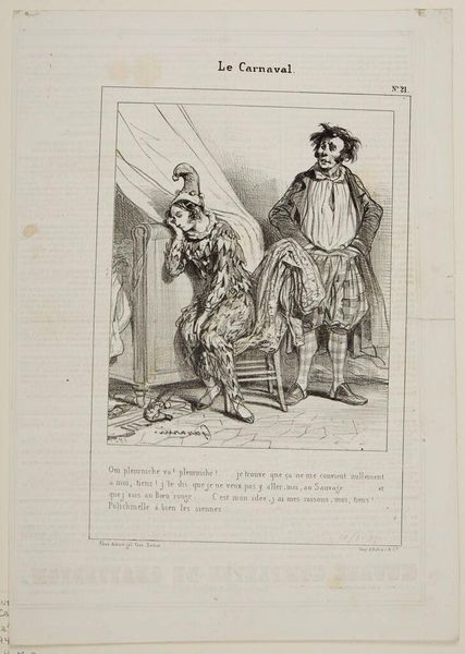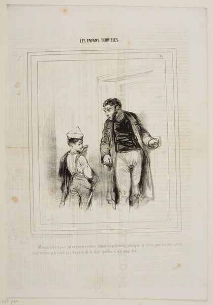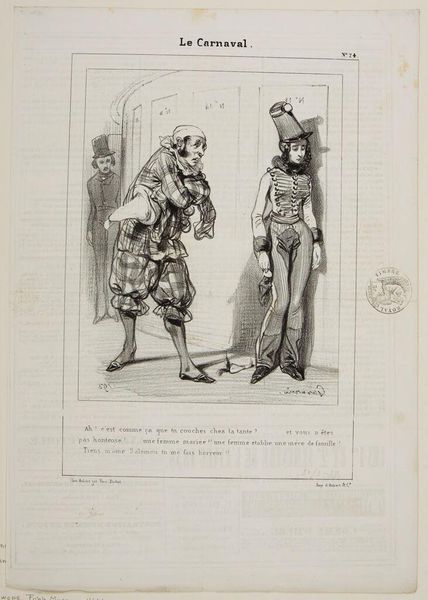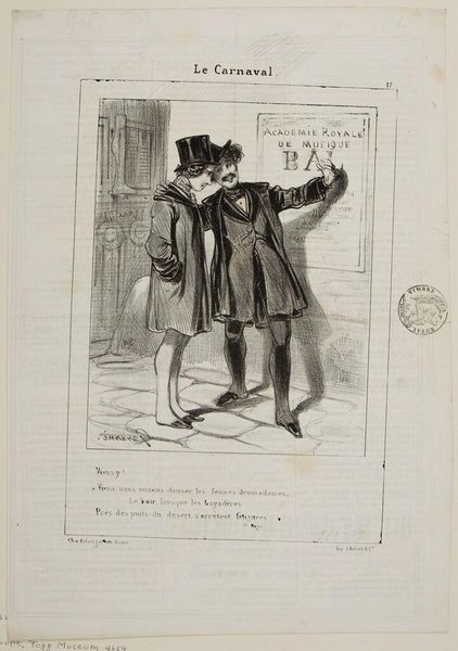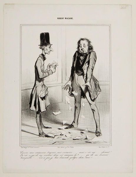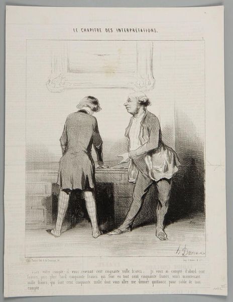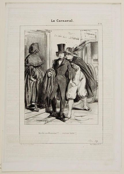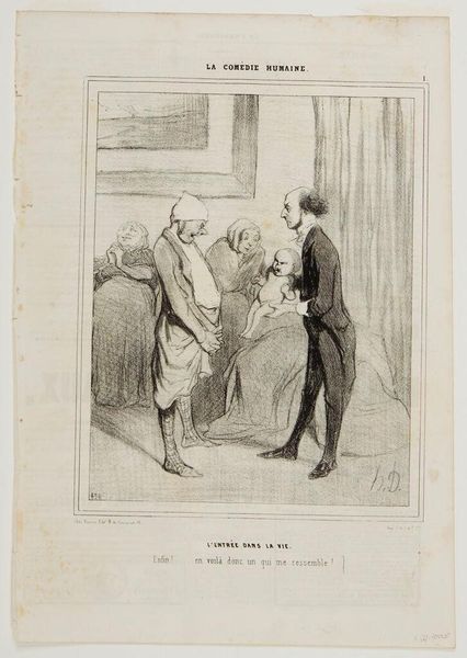 Curator: Oh, look at this lithograph, "By Jove, Baron, I'm very happy to run into you..." by Paul Gavarni. I adore the exaggerated expressions. Editor: The immediate impression is of satire, but it feels a bit… constrained. The linework is precise, almost industrial. How was it produced and distributed? Curator: Gavarni was a keen observer of Parisian society. This captures a moment, a little jab at social pretension and, perhaps, financial precariousness beneath the surface of things. Editor: The social context is key. Lithography allowed for mass production and distribution. The work's accessibility challenged the existing social hierarchies reflected within its very subject matter. Curator: It makes you wonder about the characters. Were they real, or composites? I find myself imagining stories for each of them. Editor: Indeed, let's consider the impact this piece had, reproduced and consumed by a diverse public in the rapidly changing world of 19th-century Paris. It’s a social document. Curator: I love that, it reminds us that art is never created in a vacuum. Editor: Agreed. It reflects and shapes the world around it, one print at a time.