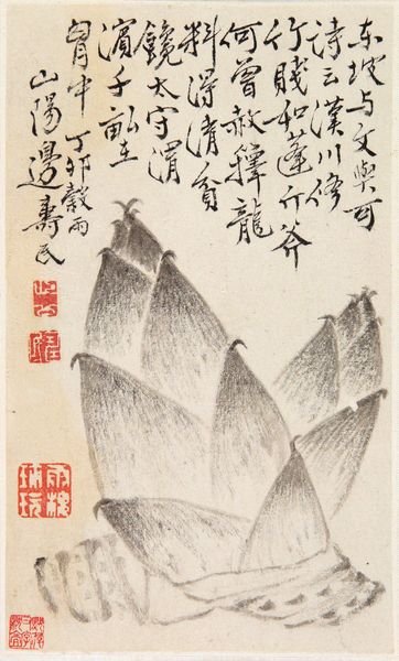 Editor: We are looking at "Rooster on a Snowy Hillside," a woodblock print in ink by Utagawa Hiroshige from around the mid-1830s. It's deceptively simple; the stark black rooster against the muted colors feels both vulnerable and defiant. How do you interpret this work? Curator: The rooster is a loaded image. Think about its historical role across cultures - from a symbol of vigilance in ancient Rome, to a sacred bird in some African traditions, or even just as a farm animal. Hiroshige plants the bird in a snow-covered landscape, doesn't he? Editor: Yes, a lonely hillside. Curator: Exactly. The snowy setting could represent a moment of stark clarity or even a period of hardship, couldn't it? In Japanese culture, the rooster also heralds the new day. So we have both vulnerability and resilience here, side-by-side. Does that pairing ring true for you? Editor: Definitely. I hadn’t considered all those layers. The rooster’s posture, head down, pecking in the snow…it does convey a sense of survival. Curator: Consider too the haiku alongside the image. Often these poems serve not to explain, but to resonate. Are the bird and text separate? Or does one echo the other? Are we seeing a specific rooster, or is Hiroshige hinting at broader societal themes of perseverance during turbulent times? Editor: That connection to the poem adds another level to the interpretation. It's fascinating how much symbolism can be packed into such a seemingly simple image. I'll never look at a rooster the same way. Curator: Nor will I. The interplay between naturalism and symbolism… it's a lasting testament to art's power.