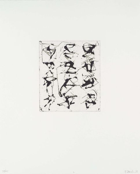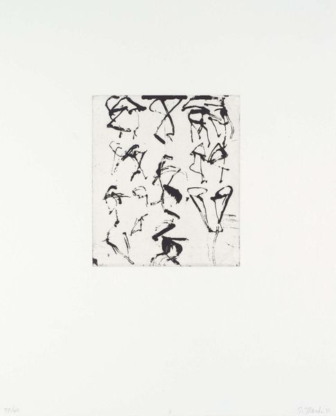Editor: So this is Brice Marden’s “12,” an undated etching at the Tate. It looks almost like a deconstructed figure, or maybe even a protest sign. What do you see in it? Curator: Marden’s work, especially his drawings, often reflects a struggle with representation within abstraction. Consider the social and political anxieties during the late 20th century—could these fractured lines symbolize a breakdown of traditional structures? Editor: That's interesting. I hadn't thought about it in terms of social commentary. Curator: Can we consider the artist's role as a mirror reflecting societal fragmentation? The stark black and white also evokes a sense of urgency. Editor: I guess the simplicity makes it more powerful in a way. Curator: Precisely! It challenges us to question the narratives we inherit. Editor: Thanks, I see it with different eyes now. Curator: Absolutely, art is a dialogue, constantly evolving with our understanding.