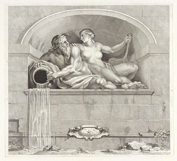 Curator: This drawing, "She Nothing Said, But Pale and Meek, Arose and Knelt Before Him," was completed in 1885 by Will Hicock Low. It's a beautiful piece housed right here at the Art Institute of Chicago, rendered with pen, ink, gouache and charcoal. Editor: It's immediately striking. The composition feels very deliberate, almost theatrical. I find it compelling, with the stark contrasts of light and shadow that direct your gaze. Curator: The theatricality you sense stems from Low's background; he worked as an illustrator and often engaged with literary themes. Looking at the artistic choices here, what details draw your eye? Editor: Well, I notice the intricate textures of the fabrics and the meticulous rendering of the figures' drapery. And of course the classical allusions: see the bed decorated with what seem to be neoclassical fluted columns. The image teems with academic influences. How would Will Hicok Low engage with the historical artistic tradition here? Curator: Precisely. This work aligns squarely with Academic art traditions that upheld skill, knowledge, and subject matter, frequently associated with classical themes or morally uplifting stories. Considering the laborious methods to realize such a piece—the layered applications of ink, charcoal and gouache—we should not disregard its materiality. The economic reality dictates who could participate and create works of such involved technical rigor. Editor: I’m struck by the way the figures interact through gesture and expression. The emotional current hinges upon the kneeling woman—how might that form affect our perception? Curator: Low uses pose and staging strategically. Her kneeling suggests humility, submission. Consider the broader societal narratives from 1885. Representations of women often carried loaded meaning around their roles in family, morality, etc. The material choices, such as the relatively inexpensive gouache combined with the highly accessible charcoal, suggest a wider audience perhaps. Editor: So the piece prompts us to consider Victorian gender dynamics within the established visual language of art history, reflected through labor intensive means, using easily accessible materials. The implications become even richer, now! Curator: Precisely. A single work yields layers when observed through varied lenses. Editor: Indeed! A great reminder of art’s endless capacity to both reflect and question the world around it.