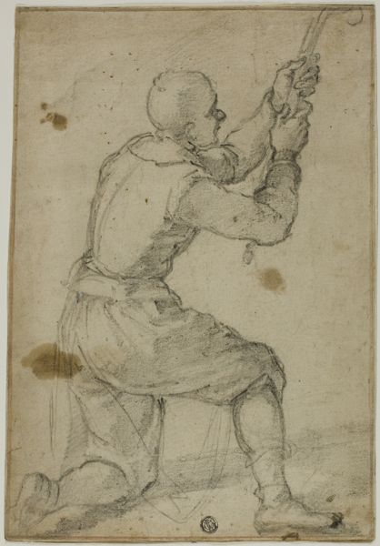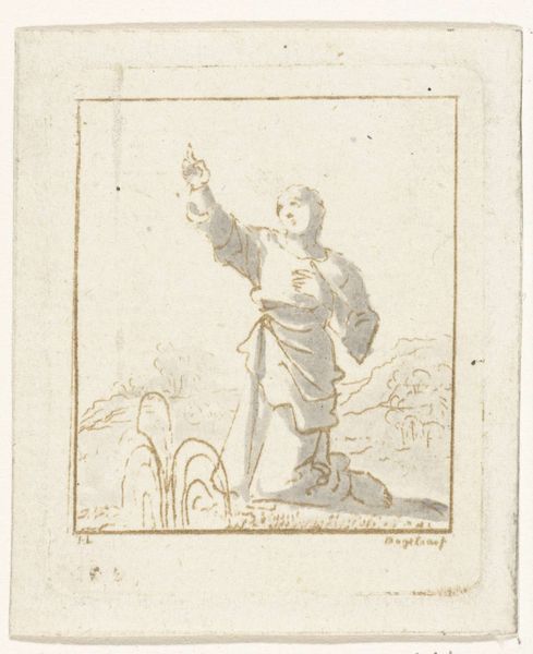 Curator: Ah, this drawing immediately evokes a sense of satire. The artist has managed to instill such unexpected nobility into what seems like an animal caricature. Editor: It certainly makes an impression. Here, we're looking at "Abe-præsidenten i Martinia," or "Ape-president in Martinia." Created between 1743 and 1809 by Nicolai Abildgaard, this intriguing piece employs pencil on paper. It is currently housed here at the SMK, Statens Museum for Kunst. What do you see here that inspires that satirical impulse? Curator: The figure itself! It has the head of a monkey, wearing a wig and draped in classical robes! Its hand gestures feel theatrical, perhaps mocking political or social posturing. It also triggers something more primal. I’m immediately reminded of similar animal figures in other periods used as powerful and emotive metaphors for mankind's fallibility. Editor: I see what you mean, there's definitely a rich vein of political commentary running through this piece, made even sharper by that juxtaposition of the animal figure with the trappings of authority. Consider the period! Abildgaard worked during a time of immense political upheaval. What better way to criticize leadership than to depict it as animalistic? Curator: Exactly! Animals carry heavy cultural weight. The choice of a monkey specifically… traditionally, in Western art, they symbolize foolishness, imitation, and the baser instincts. So this "ape-president" is hardly a flattering portrayal. It plays on deeply ingrained societal prejudices of seeing leadership acting on its most primitive instincts! Editor: And that location—"Martinia," which sounds like a fantastical or satirical location. This imaginary locale allowed Abildgaard to explore sensitive topics without directly confronting specific individuals or places within Danish society. A safe distance that allowed for more acute satire. The very choice of a "drawing," not an oil painting, would lend it some discretion. Curator: It allows it a playful subversiveness! But do you see how those light pencil strokes render such a dramatic sense of scale? Those hills beyond and the sparse tropical foliage add this veneer of context. There are some delicate balancing acts happening in the composition! Editor: It's as if Abildgaard invites the viewer to decipher the symbolic layers, questioning the very nature of power and its potential for absurdity. A thought-provoking piece, really. Curator: Yes, a subtle dance of critique conveyed through an engaging image. Definitely leaves one with more questions than answers!