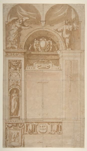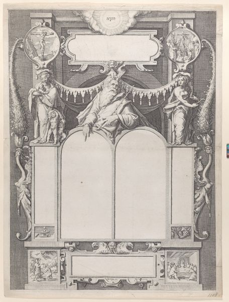 Curator: What a fascinating image. We're looking at "Triumphal Arch," an etching and engraving created in 1629 by Melchior Tavernier. It's housed at the Metropolitan Museum of Art. What strikes you first about this image? Editor: Immediately, the crisp lines, the incredible detail for such a small image. There’s a formality here, a stark black-and-white that suggests precision and calculated grandeur, a hallmark of the Baroque. Curator: Precisely. Triumphal arches, even depicted on paper like this one, were loaded with symbolism. Note the crowns, laurel wreaths, and the royal coat of arms at the top. These are clear symbols of power and victory, celebrating the French monarchy. It's a potent statement about legitimacy and divine right. Editor: And those figures flanking the arch? Classical warriors above what seem to be subdued captives? The contrast is stark, underlining the message of dominance through classical motifs. Tavernier employs classic Baroque compositional strategies through the careful articulation of figures in specific spatial relations. Curator: Indeed. The figures evoke Roman precedents. The captives remind the viewer of conquest and submission. The entire structure functions as a stage set for royal power. Even the small scenes at the bases suggest battle and military strength. Editor: Yet, considering this is from a book commemorating a royal visit, the medium—an engraving rather than, say, a painting—tempers the bombast, or better, renders this grandeur more abstract. It suggests a diffusion of royal power via print, a controlled and disseminated image. Curator: Good point. It speaks to the power of reproducible imagery. Tavernier wasn't just creating a picture; he was manufacturing an ideal, replicating and amplifying the image of royal triumph across France and beyond. Each copy reinforced the same symbolic language of power. Editor: It’s almost chilling how effectively this architectonic representation communicates such a rigid, hierarchical worldview. Curator: Absolutely. These carefully rendered lines built not just an arch, but a lasting visual memory. Editor: Looking at this makes me wonder about the role of propaganda. It seems clear now how potent such stylized imagery was in constructing cultural meaning.