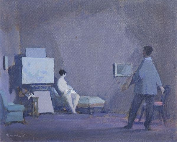 Curator: Omer Mujadzic's painting, currently titled "Untitled," presents an intriguing scene rendered in oil, acrylic, and gouache. What strikes you initially about this piece? Editor: It's dominated by this melancholic blue. It feels still, almost frozen in time. A quiet, somber gathering. The light seems to emanate from within, creating this strange, ethereal atmosphere. Curator: Yes, the chromatic scale certainly establishes the initial tonal quality. Note the subtle interplay between the verticality of the seated figure on the left and the horizontality of the family grouped together to the right. The geometric interplay almost splits the painting into individual stories within a unified space. Editor: I see your point about the composition, but what draws my eye is how this indigo hue traditionally speaks to sadness, reflection, and perhaps even mourning within a familial setting. The women's dress, reminiscent of sorrowful iconic portraits of Mary, creates a heavy psychological subtext. Curator: I would suggest it could simply be a study in complementary contrast: a blue environment offset with accents of yellow and red creating depth. While an interesting reading, focusing solely on symbolic elements undermines a rigorous interpretation based solely on the surface's formal structures. Editor: But those "surface structures," as you call them, reinforce traditional symbolism! Observe how the positions of the figures recreate typical groupings seen in religious paintings—a nod to family devotion and timeless suffering. Curator: Well, let’s simply appreciate the masterful layering and tonal precision without being overtly interpretive and instead explore the intentionality of the painterly gesture. Perhaps further investigation of the subject's art history will add to its deeper readings. Editor: Regardless, Mujadzic’s ability to capture that feeling of quiet, internal contemplation through visual language truly gives it a powerful, evocative spirit.