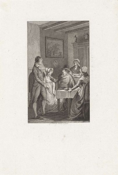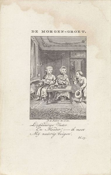 Editor: This print, "Children Singing with Their Father and Mother by an Organ" by Barent de Bakker, created in 1789, feels very intimate. You can almost hear their voices. It's just an engraving, but what is its value today? Curator: As a print, its value lies not in its uniqueness but in its reproducibility. Consider the socioeconomic implications of easily distributed images during this period. Who had access to such imagery, and what messages were they consuming? Was this affordable for the artisan class, or only accessible to the burgeoise, informing how they thought about their role in society? Editor: I see what you mean. So, the very materiality of the print – the paper, the ink, the method of reproduction – is just as important as the image itself. Curator: Precisely. The choice of engraving suggests a specific mode of production, reflecting labor practices. What does this say about the artist's relationship to their work, and the market forces at play in 18th-century Holland? Think about the consumption of images, the market of devotional artworks or portraits for domestic interiors at that time. Were prints viewed simply as decoration, or did they function as social currency? Editor: Interesting! The description mentions that it’s printed on aged or toned paper; how does this affect our perception of its meaning and value now? Curator: It changes our perception greatly. The “aged” effect makes the viewer conscious of its historical significance and process; the change and degradation of the image makes the viewer conscious of materiality. Editor: So, considering the materials and production process opens a window into understanding the broader societal values and power structures of the time? Curator: Exactly! By analyzing the "how" and "what" of its creation, we understand this engraving as more than just a charming family scene, it's an entry point to the material conditions of its era.
