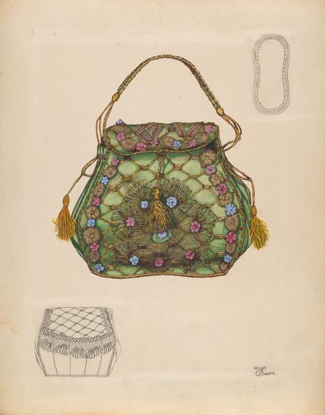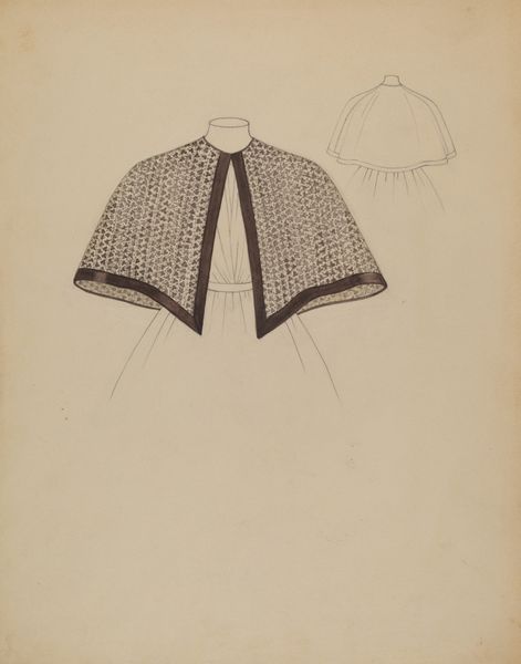 Editor: Here we have Roberta Spicer's "Sunbonnet," likely from around 1936, rendered with pencil and watercolor. I find the detailed rendering of the fabric juxtaposed with the sketched outlines of other views particularly intriguing. What formal qualities strike you most? Curator: The composition immediately directs my attention to the interplay between meticulous detail and deliberate incompleteness. The fully rendered sunbonnet serves as the focal point, its textures and patterns meticulously described. How does this contrast with the ghosted images behind? Editor: The outlines certainly simplify the form, drawing attention to the structure rather than the surface details. They feel almost like diagrams, less about capturing the 'look' and more about understanding the 'make' of the object. Curator: Precisely. This juxtaposition serves to highlight the artwork's focus on the interplay between form and representation, as we compare a completed object to an abstracted idea of that object. Do you also observe how the lines within the hat point towards different depths and levels? Editor: Yes, I do. It almost flattens and complicates the image all at once, with an ambiguous perspective of what is to be conveyed by the artist. Curator: An astute observation. What this piece presents to its viewers is a semiotic message open to interpretation, even philosophical interrogation. This allows Spicer’s study to endure with endless subjective lenses in different contexts. Editor: That’s a really insightful way to look at it; I hadn't considered the different representational layers. Now I'm seeing the incomplete bonnets not as just drafts, but as part of the final art itself, contributing to the discourse. Curator: Indeed. These elements enhance the intrinsic qualities of Spicer’s visual form. The drawing fosters discussion and reveals new perspectives for its audiences.