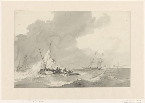 Willem Anthonie van Deventer created this artwork, "Rowboat at Sea," using etching techniques. The dominant symbols here are boats, vessels navigating the waters, metaphors for journeys, and passages. In antiquity, boats ferried souls across the rivers of the underworld. Think of the Egyptian sun god Ra, traversing the heavens in his solar barque, an image echoed in Viking burials, where the dead were set aflame in ships to reach Valhalla. The significance of these symbols persists through time in many cultures. Here, this small rowboat is dwarfed by larger ships, suggesting themes of human endeavor against the vastness of nature. The rowers push against the waves, and evoke a sense of struggle and determination, a powerful force that resonates deep within us, stirring primal memories of survival and exploration. Consider the cyclical nature of these symbols, recurring across centuries. The boat, initially a sacred vessel, transforms into a symbol of human exploration, yet retains its deep, subconscious connection to passage, transition, and the unknown. The boat continuously resurfaces, carrying the weight of human emotions through time.