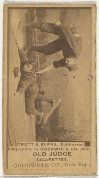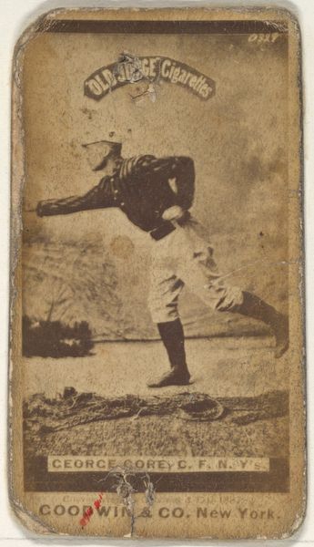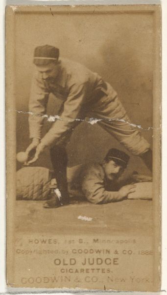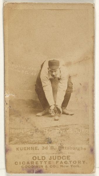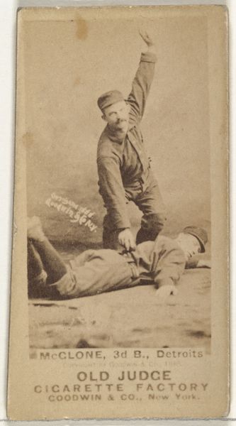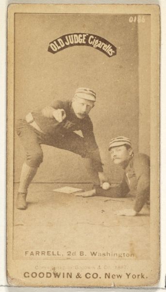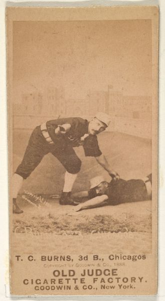 Editor: Here we have "Nicholson, 2nd Base, St. Louis Whites," an albumen print from 1888 by Goodwin & Company. It feels… gritty, almost, a snapshot of a sport rapidly gaining popularity. What’s striking is the clear advertising purpose here. What do you make of it? Curator: The "Old Judge" series illuminates the burgeoning commercialization of leisure in late 19th-century America. Think about it: baseball, a sport deeply intertwined with notions of masculinity and national identity, became a vehicle for selling cigarettes. This card is less a celebration of athleticism and more a piece of carefully constructed marketing. Editor: So, it’s about branding more than baseball? Curator: It's a fascinating example of how consumer culture appropriated sports. Albumen prints were becoming quite common; it’s almost an early form of mass media, wouldn't you agree? What’s interesting is how they chose to depict Nicholson here, towering over a fallen player; how might that contribute to the brand identity? Editor: Hmm, it seems like they were attempting to associate ‘Old Judge’ cigarettes with power and victory? Was there something particularly unique about baseball being used this way? Curator: Absolutely! It reflects baseball's elevated cultural status, aligning with themes of progress and national unity prevalent in the period. Remember, though, mass culture has political implications too; in what ways do you think that early sports advertising perpetuated the construction of race, gender, or class roles at that time? Editor: That's a really compelling thought! I hadn't considered the role advertising plays in shaping social norms… Food for thought indeed. Curator: Precisely, analyzing the role institutions like businesses have on culture allows for such analysis.