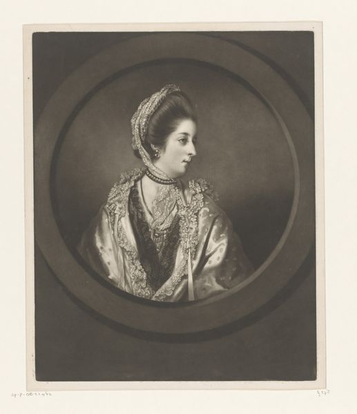 Curator: Here we have James McArdell's "Miss Anne Day, afterwards Lady Fehoulet," housed right here at the Harvard Art Museums. Editor: The lace! It's almost overwhelming, creating a frothy, textural landscape around the subject. Curator: McArdell was a master of mezzotint, note how the gradations create such a soft, almost ethereal quality. The portrait adheres to conventions, but it's the symbols of wealth that really speak. Editor: Absolutely, the fur muff, the elaborate hat. These aren’t just details, they’re potent emblems of social standing and aspiration in that era. One also feels her reserved and proper attitude. Curator: I agree. It's the tension between the surface adornment and that carefully controlled expression that makes the piece so compelling. Editor: A lovely work, it really makes one think about social roles. Curator: Indeed. It prompts questions of identity, representation, and the power of visual language.