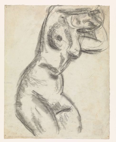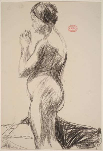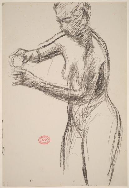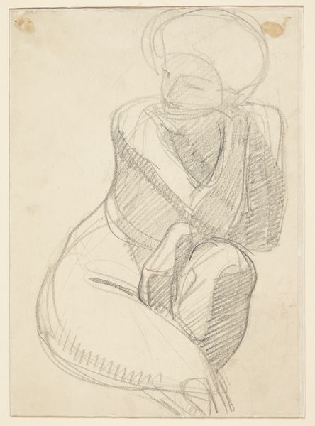 Editor: This drawing, from between 1955 and 1967, is another "Untitled" piece by Richard Diebenkorn. It depicts a seated nude, rendered in pencil, holding what appears to be a shoe. I’m struck by how raw and gestural it feels; the lines are so immediate and unrefined. What do you see in this piece? Curator: Well, seen through a historical lens, this drawing reflects the shifting artistic climate of the mid-20th century. Diebenkorn's movement towards abstraction, yet retaining the figure, becomes significant. The subject matter, the nude, while traditional, is treated with a modern, almost detached, sensibility. Editor: Detached in what way? Curator: The rapid lines and obscured features don’t idealize the body. It's about capturing form and gesture more than portraying an individual. And look at when it was created, during a time of social upheaval and questioning of established norms, even traditional subjects were interrogated. What do you think the role of depicting women this way might have been? Editor: I hadn’t thought about the politics of representation, I just noticed how the visible mark-making and the unfinished quality give it a very personal and intimate feeling, like catching a glimpse of the artist's process, a negotiation between figure and form, so a move away from idealizing femininity seems plausible. Curator: Exactly, and it also moves away from a narrative of simple observation towards reflecting societal unease and searching for new modes of representation. Looking closely can uncover how artistic traditions relate to the contemporary socio-political issues. Editor: It's amazing how a simple drawing can reflect so much! I’ll never look at another nude the same way. Curator: That is the beauty of approaching art through history; you uncover complex narratives and learn that nothing is truly simple.