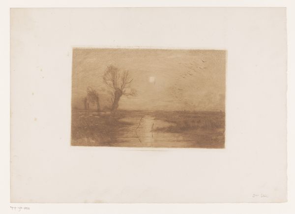 This is Jules Guiette's etching "Heidelandschap bij schemering". Guiette, working in the late 19th century, captures a landscape at twilight. This was a period of immense change and upheaval, a time when industrialization was rapidly altering the world, with artists often turning to nature as a source of solace, authenticity, and national identity. The etching's subdued tones and quiet composition evoke a sense of melancholy and introspection. The heath landscape itself—a space of transition between cultivated land and wilderness—mirrors the social and cultural shifts of the time. It's a space of in-betweenness, much like the identities of many individuals navigating the complexities of modernity. Consider how Guiette uses light and shadow to create a sense of depth and mystery. This is a landscape imbued with a sense of longing, inviting us to reflect on our own relationship with the natural world and the passage of time. The emotional resonance of the piece lies in its ability to tap into universal feelings of nostalgia, solitude, and the search for meaning in a rapidly changing world.