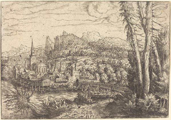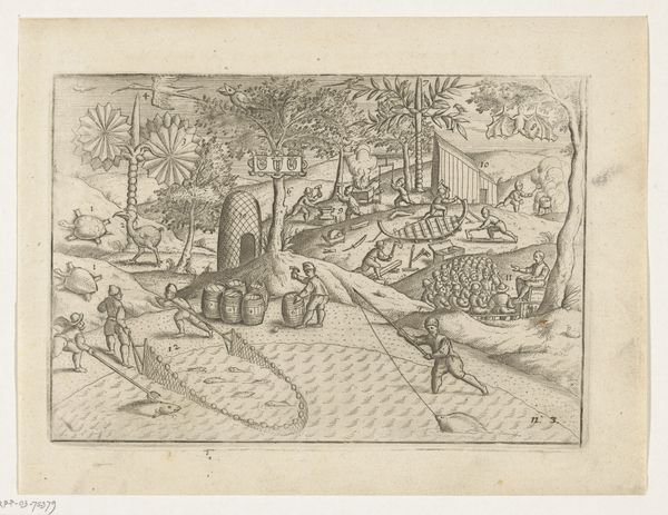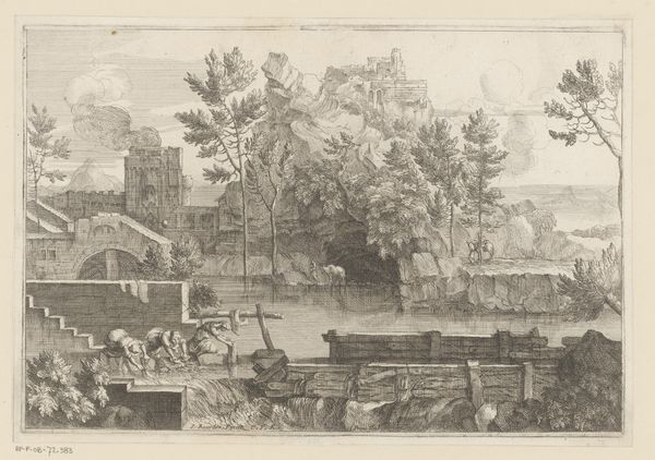 Léon Davent’s ‘Landscape with ruins, courtiers, and a gondola’ is a 16th-century print of striking formal complexity. Note how Davent uses line and composition to guide the viewer's eye through a meticulously detailed, imaginary landscape. The dense arrangement of ruins, waterways, and figures creates a dynamic visual rhythm, almost like a stage set. The artist employs a delicate etching technique, building up the image with fine lines and hatching. This creates a rich surface texture and a play of light and shadow that animates the scene. The spatial organization is intriguing. Davent plays with perspective, compressing space and layering elements to create a sense of depth. The semiotic structure here involves contrasting motifs of decay and leisure, ruins, and elegant figures, suggesting a meditation on time, history, and the transience of human endeavor. The gondola, a symbol of travel and luxury, further complicates this interplay. The artist's strategic use of line and form is not merely decorative. It invites us to contemplate the complex relationship between past and present, nature and culture, and the ways in which these elements shape our understanding of the world.