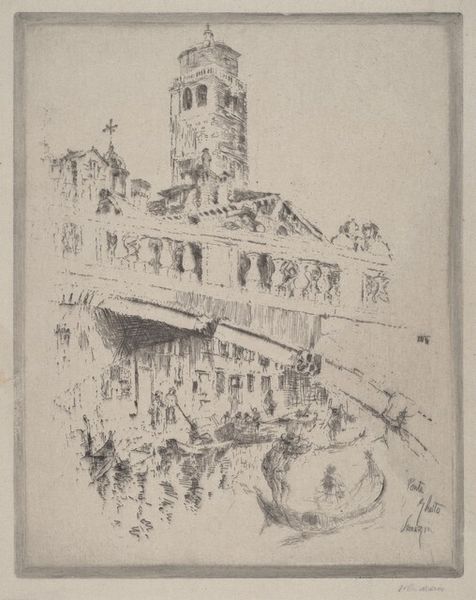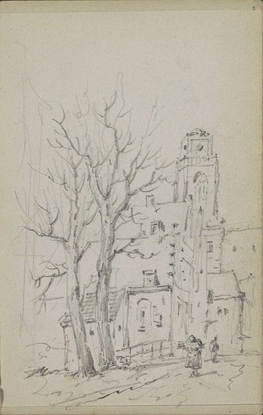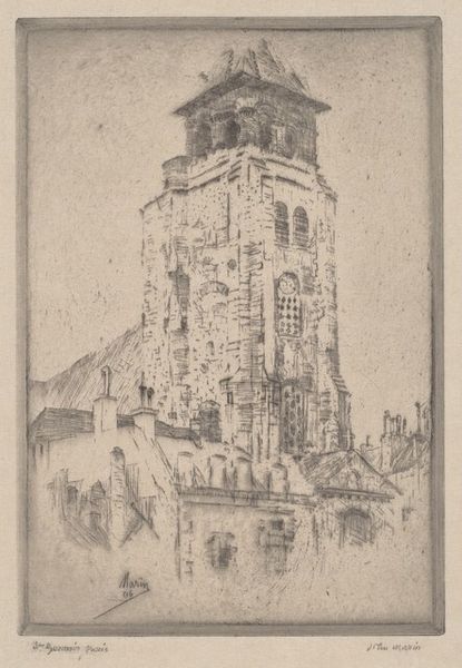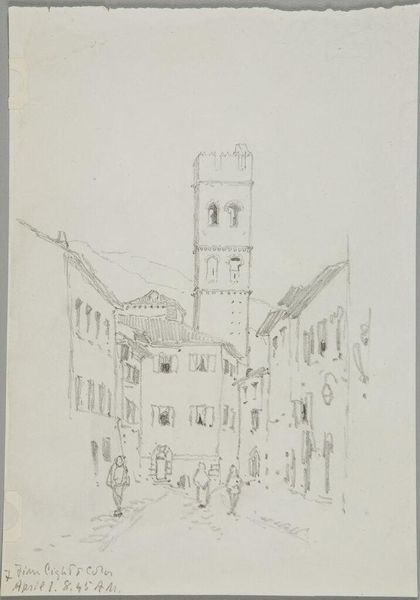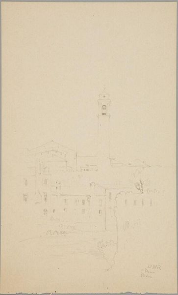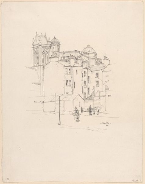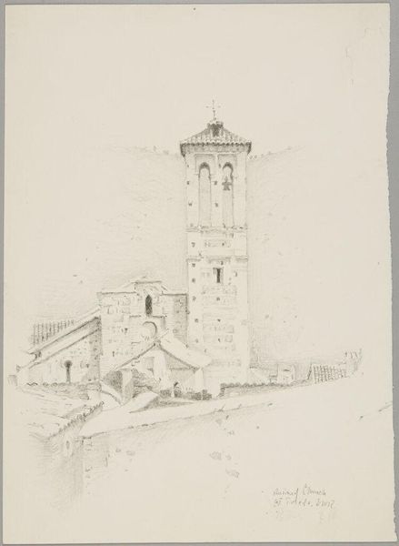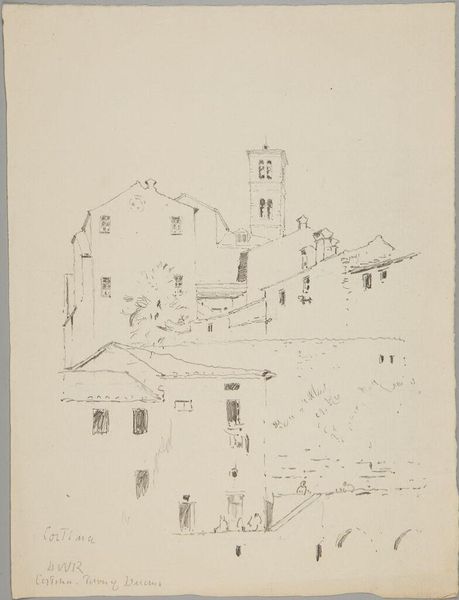Curator: Looking at this sketch, "Buildings and Tower" by Denman Waldo Ross, what strikes you first? Editor: There's a quiet, almost somber feel to it. The pale tones and simple lines create a sense of stillness. The tower seems to stand as a silent observer. Curator: Towers in art often symbolize power, aspiration, and even the divine. Here, the tower's association with what appears to be a church suggests spiritual authority, its architectural style reflecting medieval European influences. Editor: Yes, the tower does evoke a sense of stability and timelessness. The buildings clustered around it seem to huddle for protection, their forms almost dissolving into the landscape. Curator: Ross's technique, with its delicate use of line, softens the rigid architecture, suggesting a kind of integration with its surroundings. It seems to ask questions about the Church's role in the community. Editor: It's thought-provoking how simple lines can carry so much symbolic weight. The drawing invites us to contemplate the relationship between faith, community, and the passage of time. Curator: Absolutely. Ross's "Buildings and Tower" resonates deeply, offering insight into not only architectural forms, but also the deeper cultural narratives they represent.