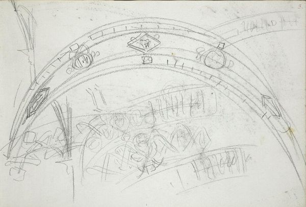 Curator: Here we have John Singer Sargent's preparatory sketch for his Boston Public Library murals, specifically the lunette depicting "The Doctrine of the Trinity." Editor: It feels provisional, ethereal. Sargent captures the essence of form, but it’s a ghost of a grander idea, no? Curator: Indeed. Sargent wrestled with this commission for decades, and I think the sketch reflects that struggle. The lunette format itself, the half-moon shape, is loaded, historically associated with religious iconography and authority. Editor: It's intriguing how he uses repeated circles and rectangles. They evoke a sense of eternity and divine order, very traditional. But is he playing with that tradition or fully embracing it? Given the context of the late 19th century, with its own crises of faith and power, this is a crucial lens for interpreting this work. Curator: It's a visual negotiation. Sargent seems to be grappling with how to represent abstract theological concepts, like the Trinity, in a rapidly changing world. It also shows the artist’s evolving engagement with institutional power. Editor: A potent reminder that art is never created in a vacuum. Sargent's sketch reveals a lot, even in its incompleteness.