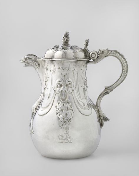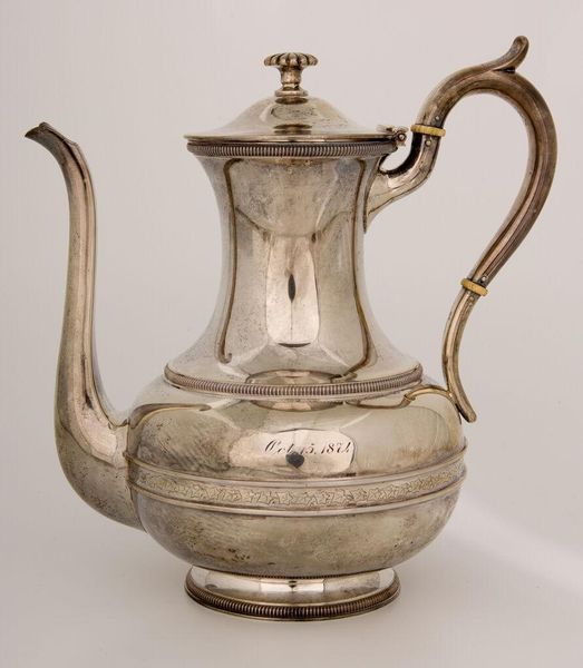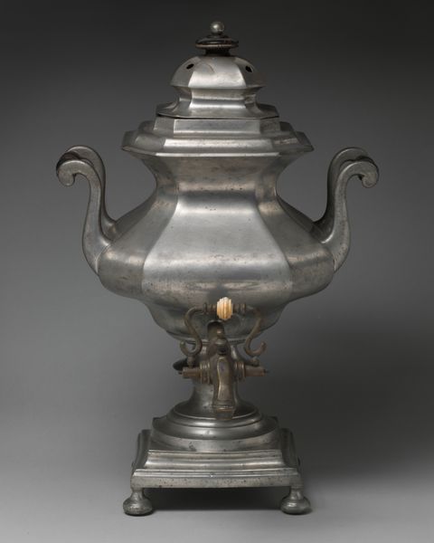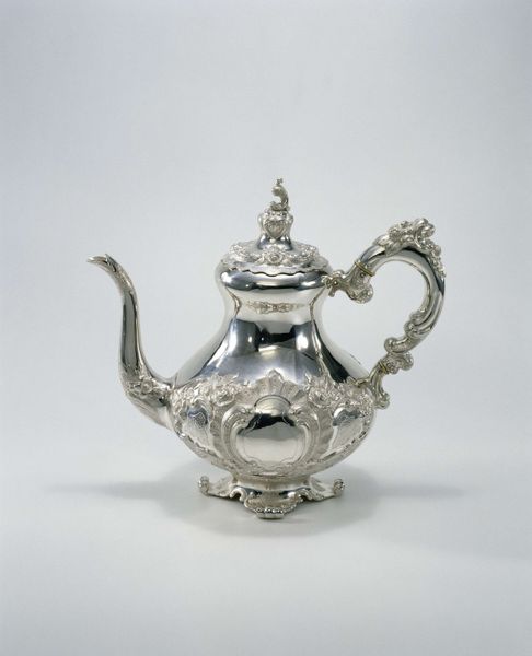 Curator: Looking at this gleaming object, I’m struck by its sheer extravagance. Editor: Indeed. What we have here is a brass teakettle, created by William Forbes between 1837 and 1840. Curator: It is more than just a kettle. Look at the meticulous craftsmanship in the decorative detailing, the intricate stand, the sculpted spout. Clearly, more labor went into its manufacture than simple function demanded. I am particularly drawn to the subtle floral patterns etched into the body. These suggest both an embrace of nature and the high level of skill required to produce such delicate metalwork. Editor: Right. Consider its placement within the domestic sphere. A piece like this would have been a centerpiece, a visible symbol of wealth and status within the household. It speaks volumes about the rituals of tea and the societal importance of the hostess, doesn't it? The entire scene screams "leisure". Curator: Absolutely, it invites us to consider the material culture of the time, its decorative elements are speaking to ideas of elegance and status. And in addition, how did artisans learn these techniques? What were their working conditions? How did this object, move through society? Editor: Excellent points! And what did tea represent socially in this period? Who had access to these refined objects? It hints at a system where the domestic rituals are, themselves, political, where things as commonplace as this teapot reinforce hierarchies. Curator: Precisely, the interplay between object, consumer, and production shapes societal behavior. Its form, while rooted in practicality, is undoubtedly elevated for show. Editor: Agreed, reflecting on this brass teakettle illuminates much more than just its aesthetic appeal. It tells us about the power structures and consumption habits that dictated daily life during that period. Curator: Thank you, considering its manufacture alongside its use provides invaluable context. Editor: And reflecting on its societal significance offers greater clarity about our shared past.
