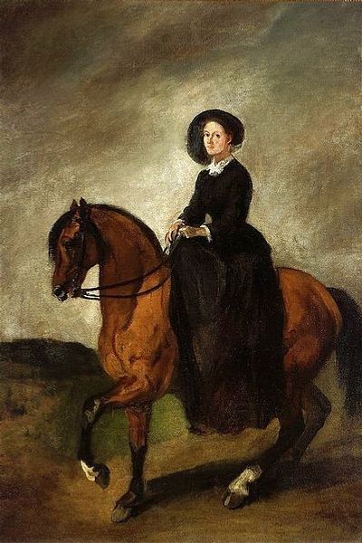 Diego Velázquez painted this equestrian portrait of Queen Margaret of Austria, which now hangs in the Museo del Prado. The portrait presents a study in contrasts, from the Queen’s pale, almost ethereal face, framed by the stiff white ruff and delicate headdress, to the rich, dark patterns of her voluminous dress, and the more earthy tones of the horse and landscape. Velázquez deploys a limited palette, relying on subtle gradations of tone to create depth and texture. Note how the Queen’s attire cascades down the side of the horse, almost merging with the landscape itself. This serves to emphasise the Queen's status, linking her to the land and people over which she reigns. Velázquez destabilizes the traditional equestrian portrait, where the horse and rider are typically symbols of power. Consider how this portrait invites us to reflect on the intersections of power, representation, and identity in the context of the Spanish court. The contrast between the detailed rendering of the dress and the more fluid treatment of the landscape destabilizes any fixed interpretation, encouraging continuous re-evaluation.