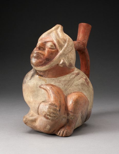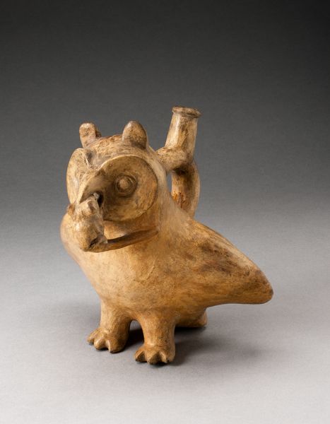 Editor: Here we have a Moche ceramic sculpture dating from 100 to 500 AD, "Handle Spout Vessel in the Form of an Anthropomorphic Owl with Clasped Hands." I’m struck by the smooth curvature and how the artist merged animal and human forms. How do you approach interpreting a piece like this, focusing on its formal qualities? Curator: Formally, observe how the artist utilizes contrasting colors to delineate the owl’s wings and face, creating visual interest and a clear separation of forms. The lines are deliberate, precise; notice how they contour the owl’s facial features, providing depth despite the sculpture's relative simplicity. Does the loop-handle itself not strike you as a line in space, drawing the viewer's eye upwards? Editor: Yes, the handle is integrated seamlessly! And those parallel lines suggesting the body – it's not just representation, but also an exercise in pure shape and form. The textures, or lack thereof, give it a kind of grounded presence too. Curator: Precisely. Consider, too, the vessel's volume, its occupation of space. It’s a static form but evokes a sense of potential energy, of contained liquid and ritualistic purpose. The symmetry lends it balance, poise – qualities often associated with contemplation and, dare I say, wisdom. Editor: So you are saying it’s about the artist creating balance between shapes to suggest meaning rather than any intended representation? Curator: Meaning arises from the orchestration of these elements, doesn’t it? Line, color, volume—all converge to articulate form and, consequently, expression. Did you note, that even the owl's “hands,” clasped so deliberately, contribute to the vessel's overall symmetry and sense of self-containment? Editor: I see now how breaking it down to form and shape is essential. The artist conveys more through shape relationships than simple resemblance. Thank you, this has altered how I understand the piece! Curator: A fruitful exercise indeed. By rigorously examining the vessel’s intrinsic elements, we unlock a more profound engagement.