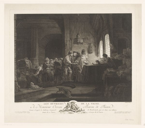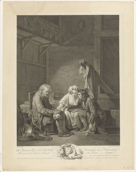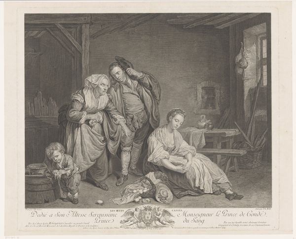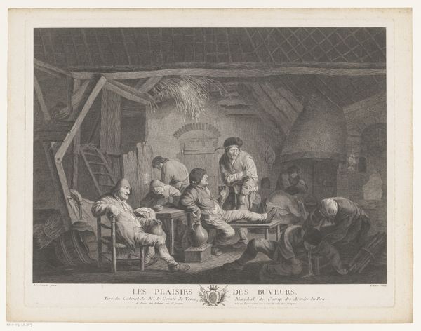 Editor: This is "Boereninterieur met bonenpellers," which translates to "Peasant Interior with Bean Shellers," an engraving from around 1760 after a painting by Teniers. The interior scene, with its dim lighting, evokes a sense of everyday labor and community. What jumps out at you in terms of historical interpretation? Curator: The most striking aspect of this print is the way it elevates a seemingly mundane activity—shelling beans—to a subject worthy of artistic representation. Genre scenes like this became popular as printmaking democratized art and allowed for wider distribution to a growing middle class. Who exactly do you imagine the audience was for an image of working people relaxing indoors together? Editor: I suppose city dwellers who are interested in rural life? Did they consume images like these just as decoration or were there some other motivations? Curator: Certainly some might have consumed this as decoration, but these images also carried significant social and political weight. Remember that the late 18th century was a period of immense social change. Representing peasants in a certain way, sometimes sentimentalizing their existence or portraying them as virtuous in their simplicity, was a way of managing anxieties about class differences and social unrest. Do you see that idyllic tone at play here, even in the subdued light? Editor: I think so. It looks idealized to me, since everything appears neat and the workers relaxed. Like the toil is gentle. Is that just me? Curator: Not at all! Consider the power dynamics inherent in who gets to depict whom, and what purpose that depiction serves. While seemingly innocent, images like this participated in shaping perceptions of different social classes and justifying existing power structures. Editor: That's something I hadn't considered fully. Thank you for clarifying the nuances. It's made me think about the politics embedded in the every-day representations. Curator: Absolutely, and by exploring those connections, we can understand art’s role in shaping our understanding of society, both past and present.