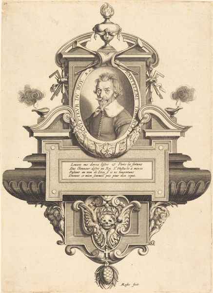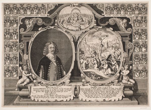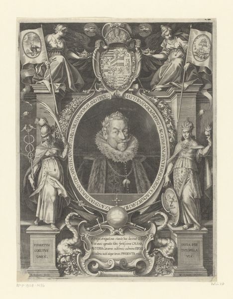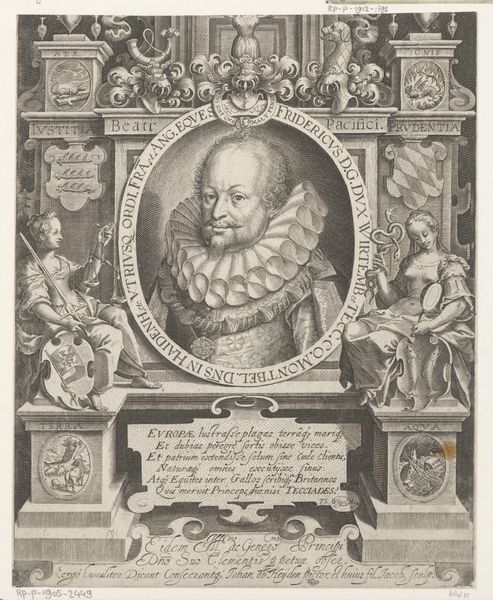 Lucas Kilian made this portrait of Frederick V in the early 17th century, using engraving. The image presents us with a visual puzzle of codes and references, all designed to project power and legitimacy. Note the Latin inscriptions framing the central image, typical of the era's elite culture. We see symbols of authority: the coat of arms, military regalia, and allegorical figures representing wisdom and strength. This wasn't just a likeness; it was a carefully constructed projection of Frederick's status as Elector Palatine, one of the Holy Roman Empire's most powerful princes. Consider the social conditions that shaped this image. The early 17th century was a time of intense religious and political conflict in Europe. Frederick V's brief reign as King of Bohemia triggered the Thirty Years' War, a conflict that devastated much of the continent. This portrait reflects the anxieties and aspirations of a ruling class struggling to maintain its authority in a turbulent world. To fully understand this image, we might delve into archival sources, political pamphlets, and theological treatises. By examining the broader social and institutional context, we can gain a richer appreciation of the portrait's significance as a cultural artifact.