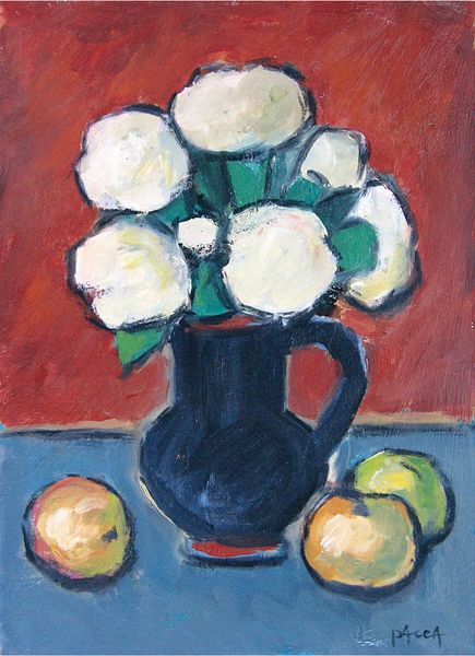 Ion Pacea, the Romanian artist, painted “White Flowers and Apples” with oils on canvas. Pacea, a Jew living in Romania during World War II, faced considerable adversity as his work was labeled as degenerate and he was prohibited from exhibiting it. This piece exemplifies the tensions in Pacea’s life and art. The flowers, with their white blooms, appear joyful and serene; they sit in a decorative pitcher. Yet, the red background suggests the intense emotions he experienced during the war. The apples add a feeling of warmth and the simple pleasures of life. Pacea developed an abstract style to cope with the political climate and express his identity. His paintings speak to the ways that artists use their work to create meaning in times of political struggle and personal reflection.